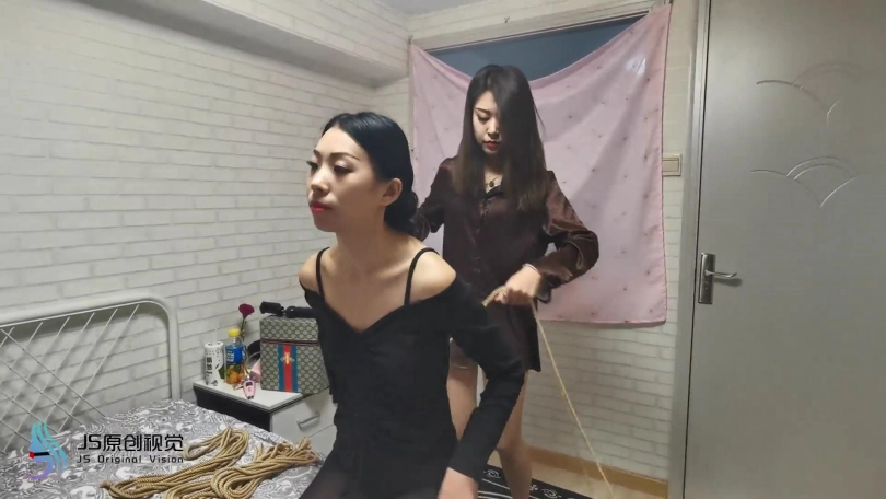 将女子捆好后对她说:“我先出去下,你在这体验捆绑挣扎一会,到时间我在进来给你解开。"
