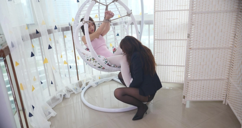 老板让女主在地上挣扎,忙完工作后走过去给她脱下衣服,还换了芭蕾服,将女主绑在吊椅上, 开始摸女主。女主急道:“这个尺度之前没有说过啊!”