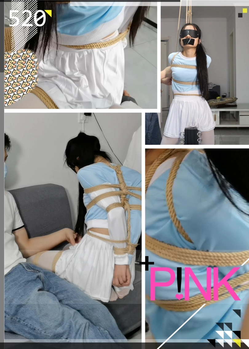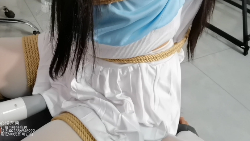 给妹子尝试一下震动之类的小玩具用起来感觉怎么样,所以没有太过较真的去强制,一开始我是想吊起来M字绑在木马上面的,但是好像操作起来很困难,只好退而求其次,绑成欧式和M字绑脚。妹子第一次接触震动的玩具,反应有点可爱。