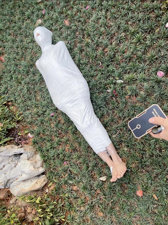 好吧,我全都要,那这次就拍一个户外-胶带全包-超长时间放置-虐足的作品吧~