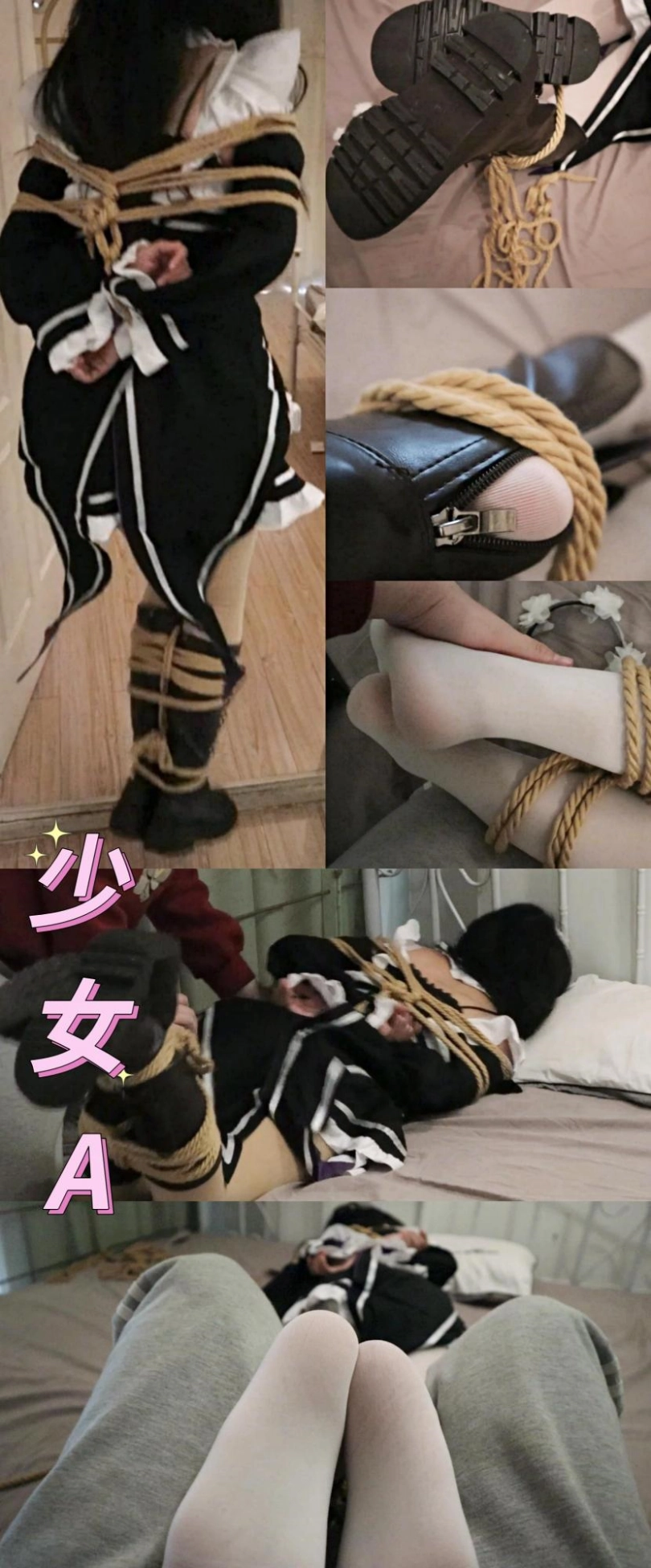 连靴子处都被紧紧的捆绑住了,少女A惊恐地想挣扎开,嘴巴也不停的叫喊着,但是身体被死死的绑住根本就无法动弹,只能被不停的玩弄揩油身上敏感的部位,不断地哭喊和笑着 哭是因为被欺负 笑是因为身上的敏感点被不停地触碰,