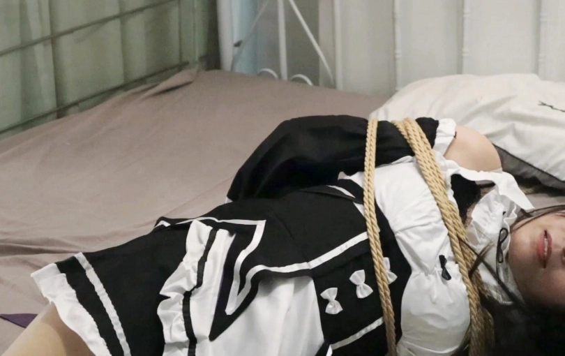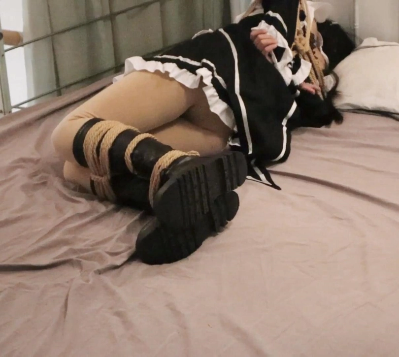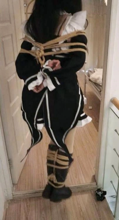一开头 肉丝女仆的少女A 日式绑好 连皮靴上都捆绑满了绳子 手脚全部旁边 这么艰难的样子 少女A一蹦一跳的跳向房间里