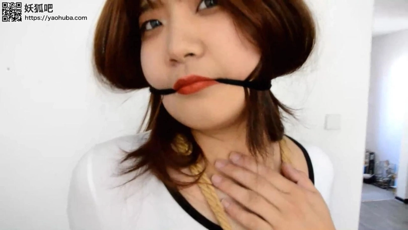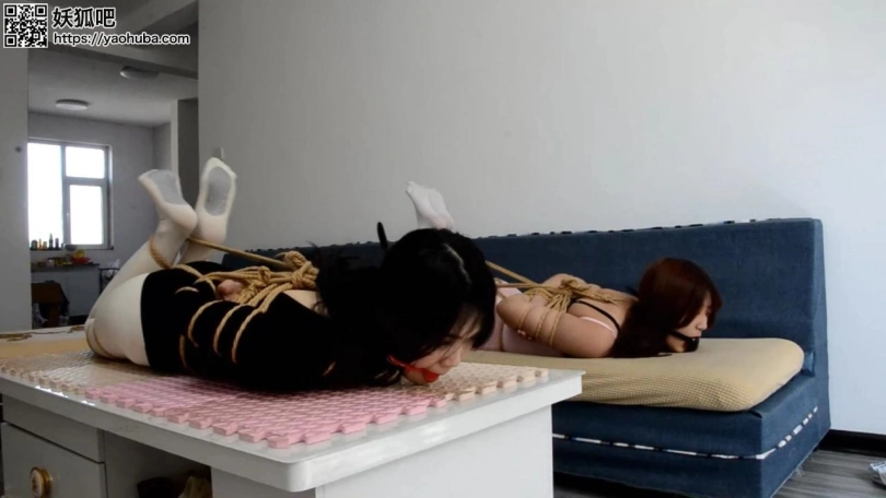 两女绑成驷马并排放置在桌子上,上身如图五花大绑,股绳,腿如图绑。手脚间绳子尽量收紧,上身翘起来。口球堵嘴,一定要流口水,有流口水的特写镜头,头发不能挡住脸。