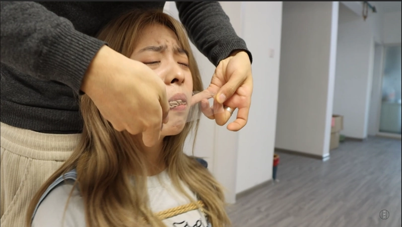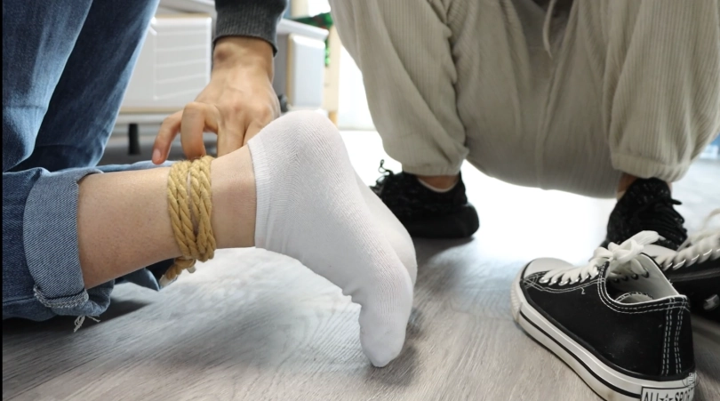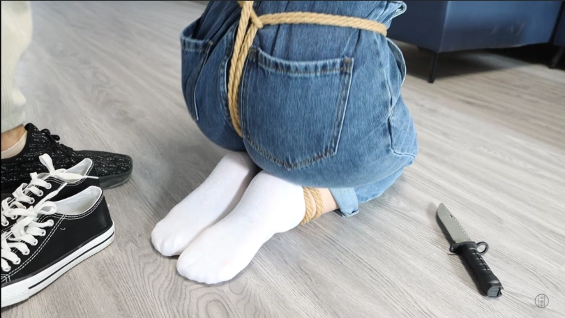 手脚被绳子捆绑,甚至连那个部位都绑着绳子,每次挣扎还会带来些许异样的感觉,跪在许斌面前的珊珊感受到了前所未有的羞辱,但这种羞辱还只是开始。嘴上不饶人的珊珊自然得不到许斌的原谅,于是脚上那双穿了三天的原味白袜便成为了堵塞她小嘴的适合之物,在阵阵呜呜声中,珊珊娇嫩的白袜脚底被许斌无情的抽打着。
