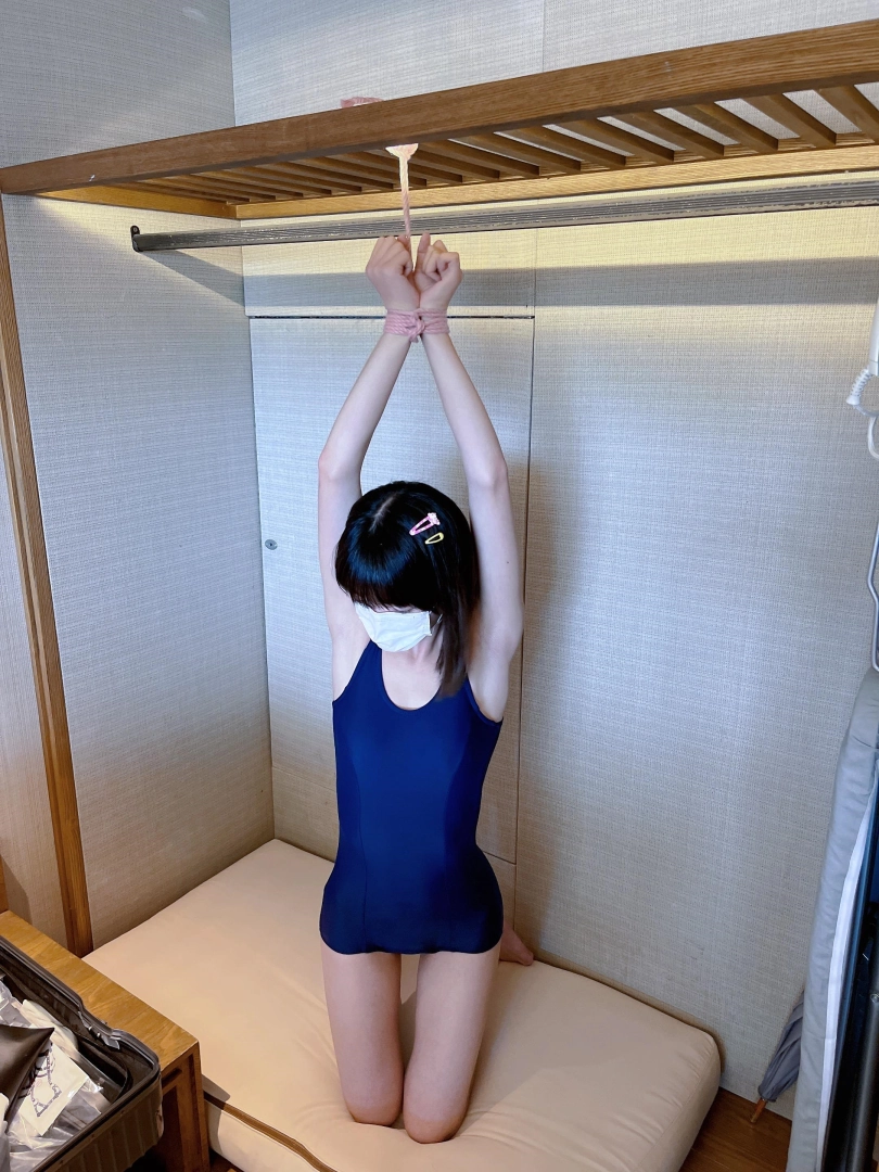 所以我把捆绑手腕的绳子绕过头顶的木梁,向下和茶茶的脚腕连接在一起,这样茶茶就进入一个进退两难的困境折磨拘束中:想让脚腕放松向下,手腕就会在脚腕重力的作用下被绳子向上拉高;想把手腕下拉休息一下手臂,脚腕就会被手腕拉扯的向上抬起,让茶茶的嫩脚心完全暴露在空气中。只能用膝盖承受全身的重量——连接手脚的绳子长度是有限的,本来就收的很紧,用尽全力也不能让脚底和腋下任何一个弱点绝对安全,但只要稍有不慎,弱点就会以最光滑平整的姿态完全暴露在空气中。