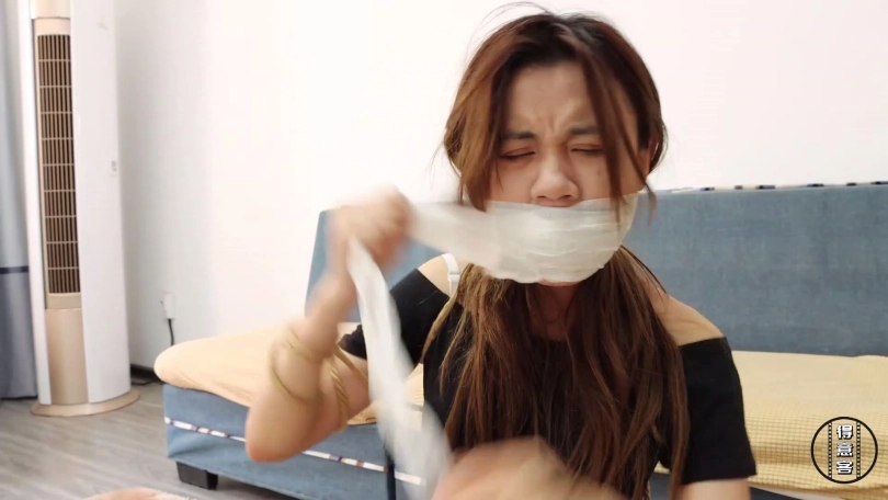 (二)被劫持驷马捆堵的冷兮及其男友经过长时间挣扎,最终冷兮率先挣脱捆绑将男友解放,二人互相帮对方撕掉封嘴自粘绷带胶带还有电工胶布,拽出口中塞嘴丝巾大口喘气。