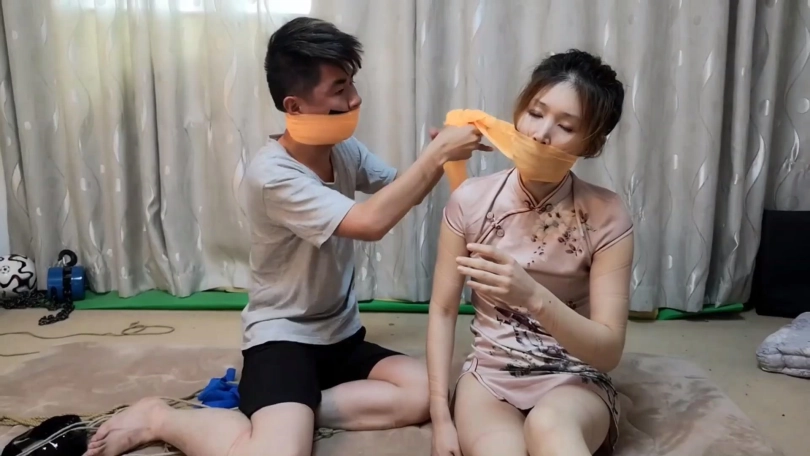 (五)遭劫被捆堵的情侣二人经过挣扎后琦娜率先挣脱捆绑,赶快帮自己男友解开,而后二人互助撕掉封嘴绷带胶带宽胶布,拽出口中丝巾丢掉大口喘气。