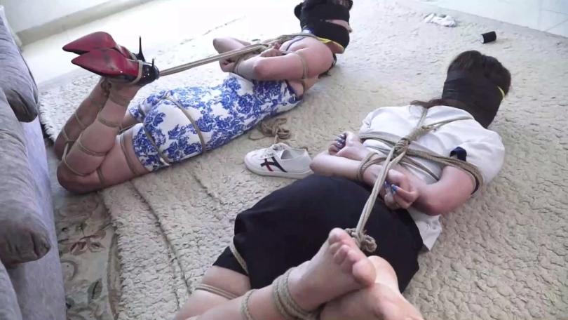 在二女一筹莫展之际锁哥得意洋洋出来,说我捆绑手法不错吧,你们没那么容易挣脱开,现在还有点时间还玩吗,二女拼命摇头表示放弃希望锁哥解开,可锁哥哈哈一笑说你们不想玩了,我还没玩够呢!锁哥将二女捆成驷马放置在沙发前地上,并表示打赌游戏二女输了,就得接受自己的惩罚。