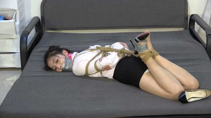 OL装小狐狸被驷马捆绑起来,而能够打开密室门的钥匙被放在她的高跟鞋里,可这只高跟鞋被用胶带固定在她的脚上。千辛万苦拿到钥匙的小狐狸却不能挣脱开捆绑逃生,下场是被绑到一张椅子上,翘着二郎腿束手就擒。