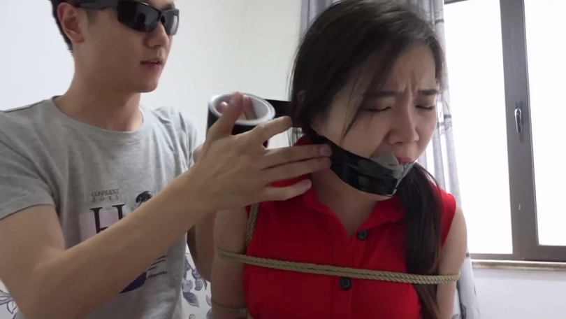 片段2:模特小雨被自己腿上穿的一条灰色连裤丝袜塞嘴,嘴巴被黑色静电胶带缠绕封住。