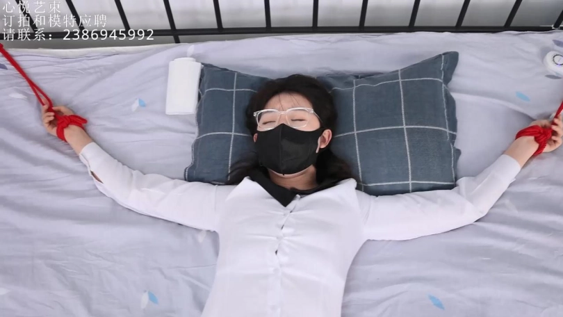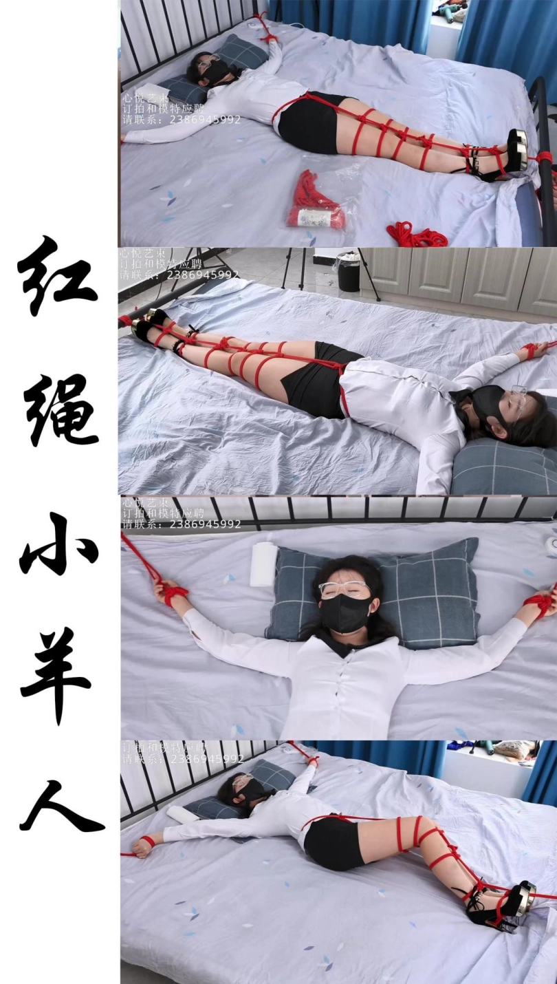 › 【心悦艺束】红绳小羊人,肉丝美腿OL羊字形绑在床上挣扎,口罩下塞着口球。