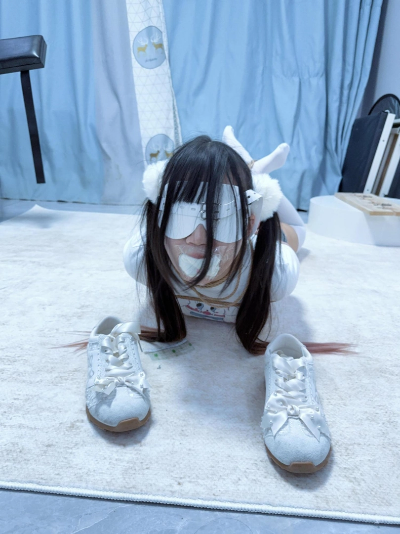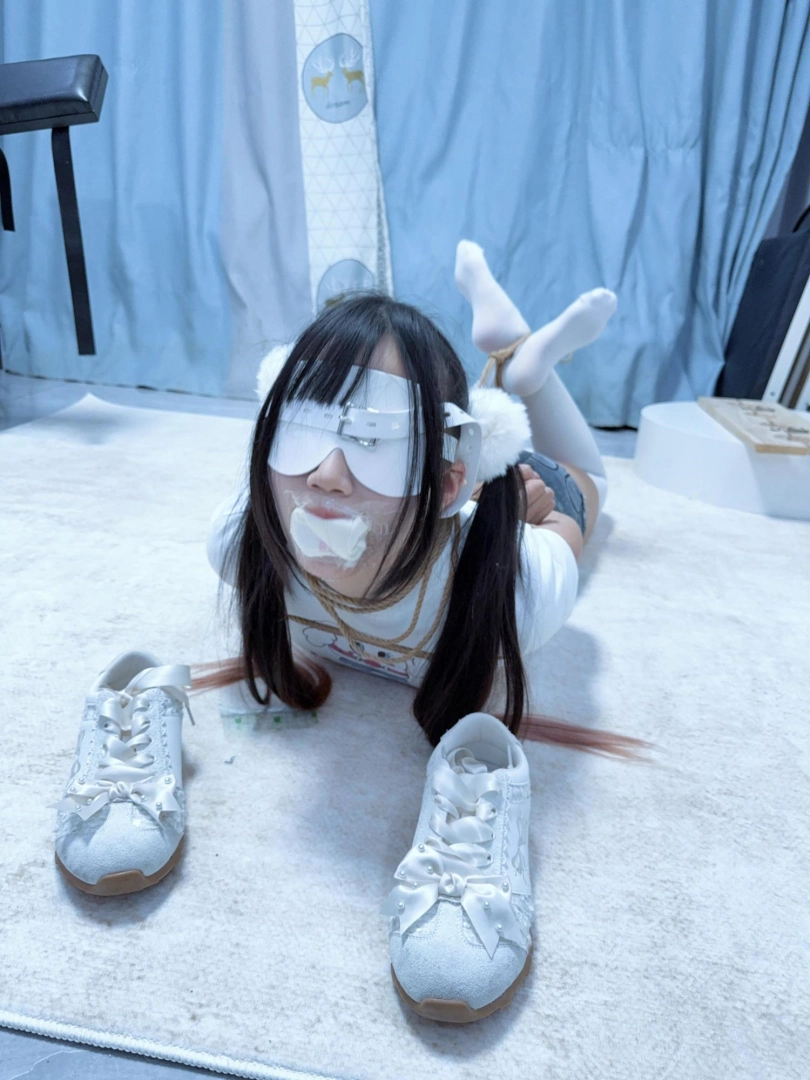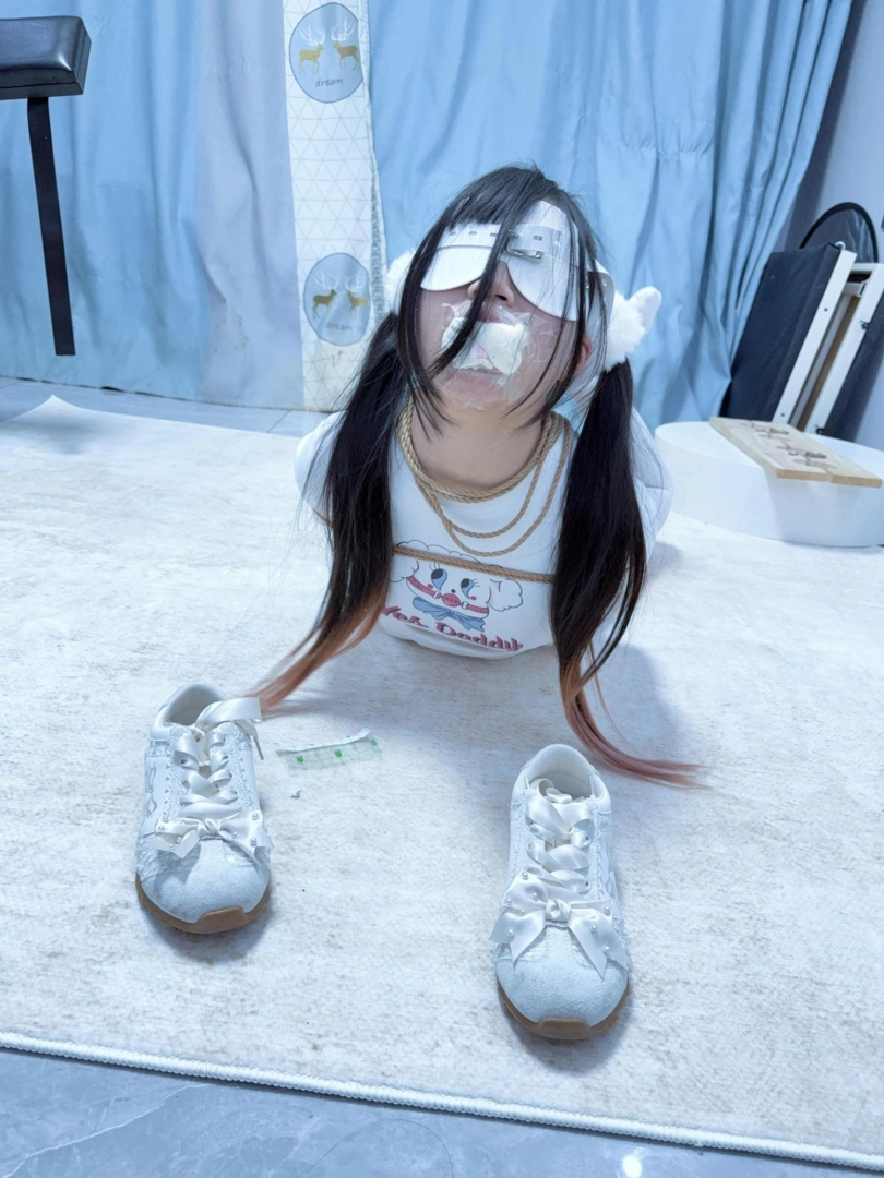不同的是这次给妹子戴上了眼罩,并且把之前脱下的原味白袜塞进妹子小嘴里,堵嘴堵的结结实实、满满当当后用透明医用敷贴贴好。透明的医用敷料可以让大家清楚的看到堵满的小嘴~