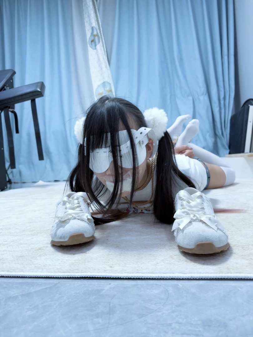 准备工作:首先把鞋子脱下,然后把原味小白袜脱下整整齐齐的摆在鞋子边。换上白丝过膝袜。