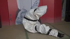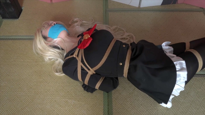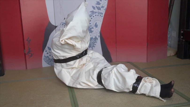 上身后高手捆绑,腿和脚也被绑在了一起,挣扎一段时间后