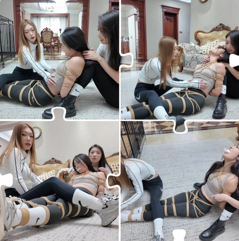 在地上玩累了,芷溪又想了个坏主意,二人将柠琪弄到沙发了,然后掏出了芷溪攒的“家伙事”--电动牙刷,齿轮,电动铁丝,这都是挠痒痒神器呀,都给柠琪招呼上,挠痒痒神器在柠琪的脖子,脸,腰,脚心等敏感部位走动着,把柠琪玩弄的发出呜呜呜的声音,芷溪可爽了。一会,她觉得玩弄柠琪一人不过瘾,想把雨诺也一起绑了,再玩一玩雨诺!接着拿绳子朝雨诺走去,雨诺抗拒着说着:不要不要。可芷溪说:把你绑起来我就开心了,我开心了就给你加工资!见钱眼开的雨诺说:给我加多少工资呀?可是把我绑起来待会坏人来了,谁保护你的安全呀!芷溪说到:坏人来了再说,先让我绑起来开心一下。雨诺说着:不要不要,可在加工资的诱惑下,半推半就的被芷溪捆绑了,把雨诺手脚都捆绑结实后,芷溪拿了双白耐克袜子,将其塞入了雨诺嘴里,然后用5张PVC胶带封上雨诺的嘴巴,防止她吐出嘴里的毛巾,就这样将雨诺也结结实实的捆绑堵嘴封嘴好了,然后开始挠着雨诺的脸,脖子,腰等部位,两位女保镖被捆绑在身边像两个玩具一样被玩弄的感觉太爽了,芷溪一会挠雨诺,一会挠柠琪,玩的特开心。随后又解开雨诺鞋带,脱了她的马丁靴,挠起了雨诺的脚心雨诺呜呜呜叫着。可是光用手可不过瘾,芷溪将雨诺跟柠琪的双脚搭在自己腿上,然后两手玩四只白袜脚,听着两美女的呜呜呜声,可开心了!玩了好长时间,芷溪累了,想回房间打游戏去了,可丝毫没有想给二女保镖松绑的意思,想了个法子,将二女保镖押走了!