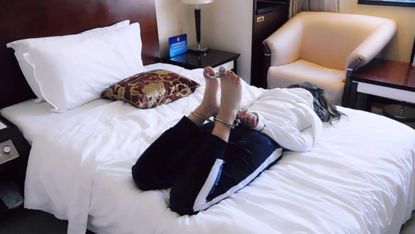 妹子来到酒吧喝酒,然而酒吧老板是个人贩子,偷偷给她的酒里下了药。妹子过了一会,就感觉不对,然后就晕过去了。这时老板觉得新弄的药还挺管用,有妹子可以玩了。老板把她驷马锁在床上,等她醒来。妹子醒来,发现自己被锁住了,十分惊慌。老板出现了,开始调戏妹子,脱下鞋袜,锁上脚趾、脚心、拇指。妹子更加惊慌,不断求饶。老板来解开镣铐,脱下了她的衣服,只剩内衣,检查身体无误后,再全部锁上,更是一顿调戏,然后离开。留下妹子挣扎,等待明天的拐卖。