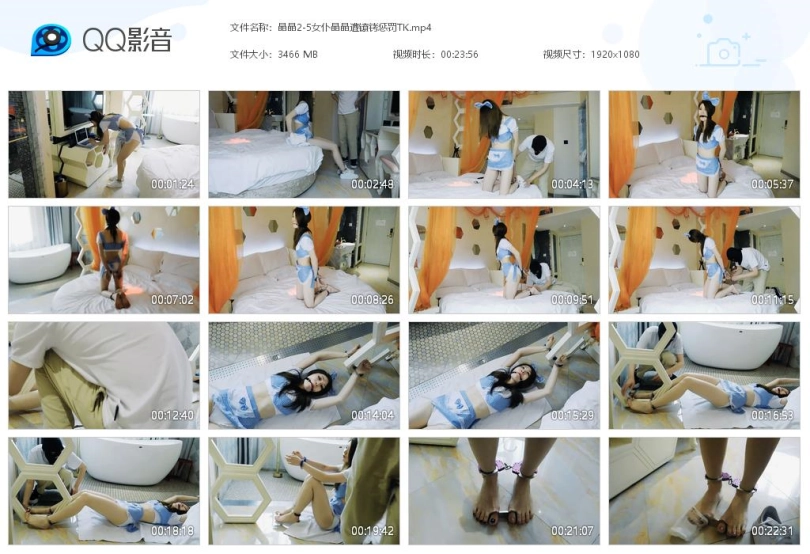 女仆平时在家里都带着脚镣,在打扫卫生。无意间看到主人的电脑还在开机,于是停下手头的工作,在玩电脑。主人悄悄地回来了,结果发现女仆正在偷懒,玩自己的电脑,十分生气,呵斥女仆。主人脱下她的鞋袜,锁上脚趾铐,让女仆跪下,解开手铐锁在背后,手脚用脚镣链接,让她跪下反思,然后离开。女仆见到主人生气,很害怕,一直在认错,哭了出来。主人回来了,还是很生气,解开镣铐,脱下衣服只剩内衣,让女仆躺在床上和椅子上,手穿过栏杆铐上,脚也穿过另一对栏杆铐上,脚趾铐住,把钥匙锁在一只脚趾上,带上口球然后离开。女仆一直扭动身体挣扎,想够到钥匙却不行,想说话也不行,十分难受。主人回来了,决定惩罚女仆,于是开始挠脚心。女仆十分难受却说不出话来,使劲求饶。最后主人决定原谅她,解开镣铐。但是决定以后不让穿鞋了,又加上脚趾铐工作,又都给锁上。妹子光着脚工作,打扫卫生,连脚趾也被锁了,十分不便。