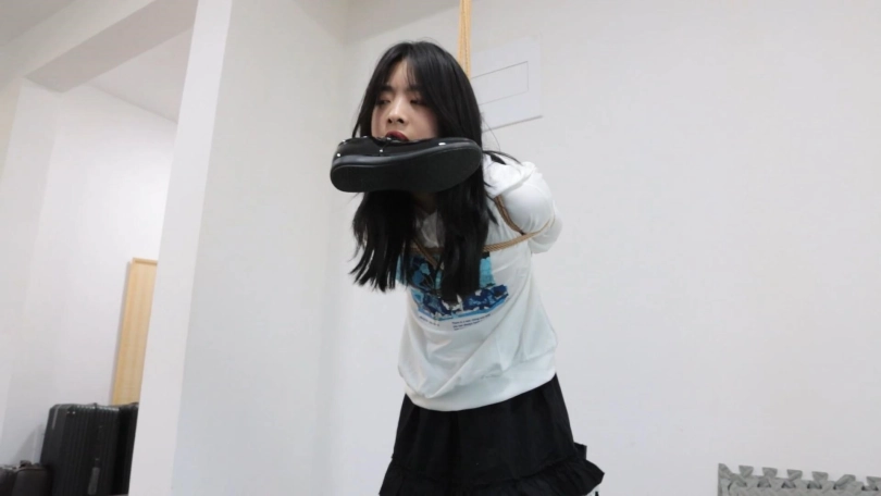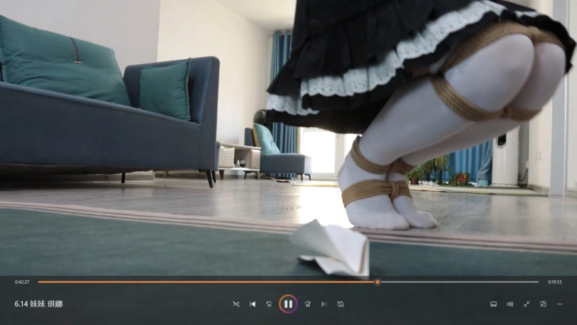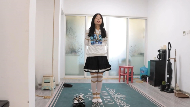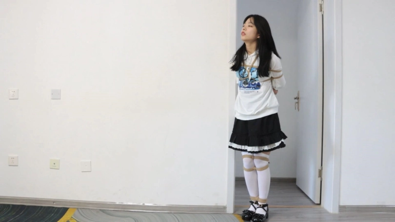——绮娜:妹妹可以在双手被捆绑在背后,双脚被并拢捆绑在一起的情况下把门口的鞋子拿过来,是不是很厉害呀!
