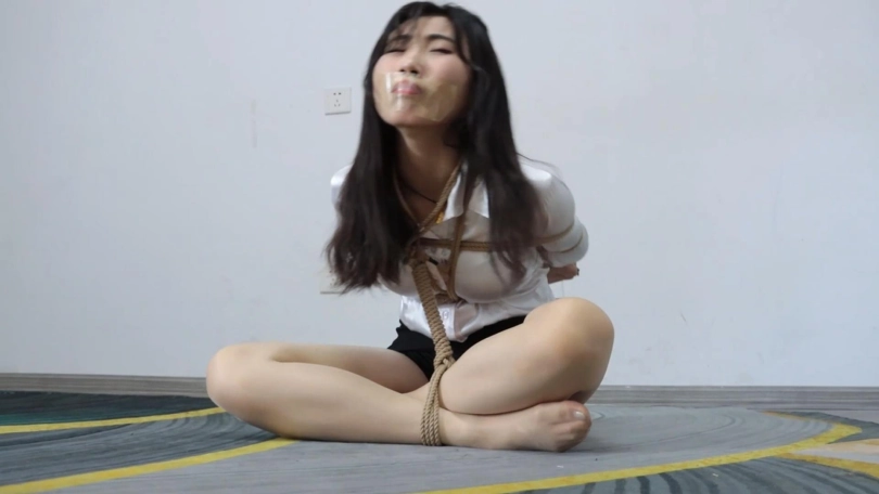 绳子将昏迷的恩可海老缚紧紧捆绑了起来,将恩可的高跟鞋脱掉,用胶带将恩可的嘴封住。