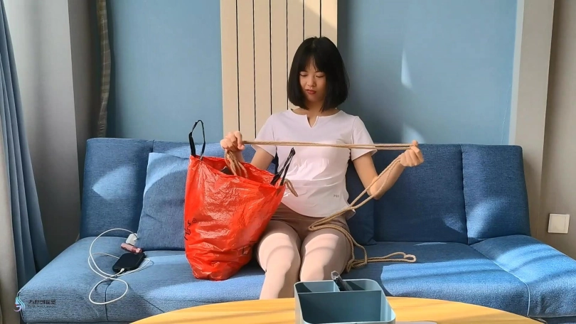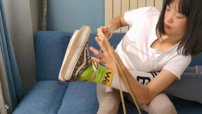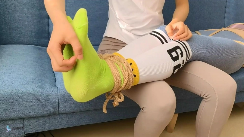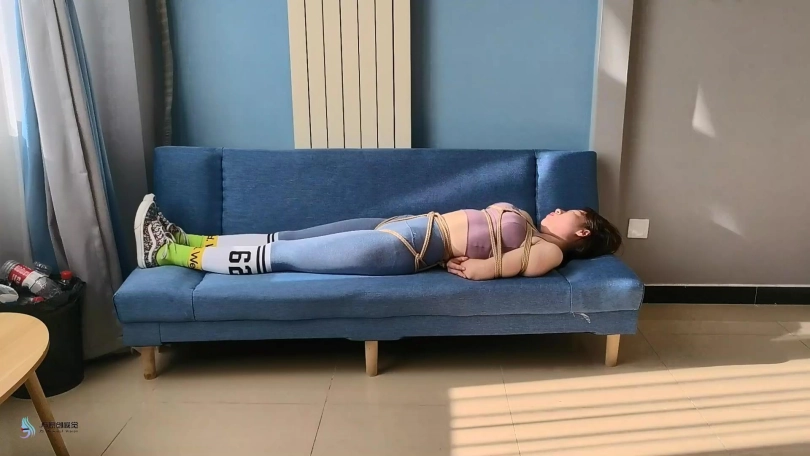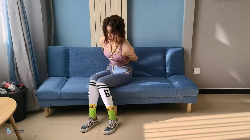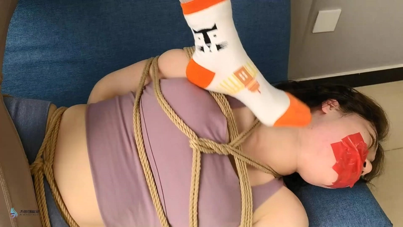 愤怒的激辣将丹维的双脚也捆绑起来,并脱掉她的鞋子,不断的挠她的脚底和抽打着丹维。在玩弄了一会后,激辣让丹维平躺在沙发上,自己脱鞋坐在沙发靠背上。她用自己的棉袜脚丫不断的在丹维的身上游走,刺激着丹维。丹维也很快发出享受的呻吟声音。