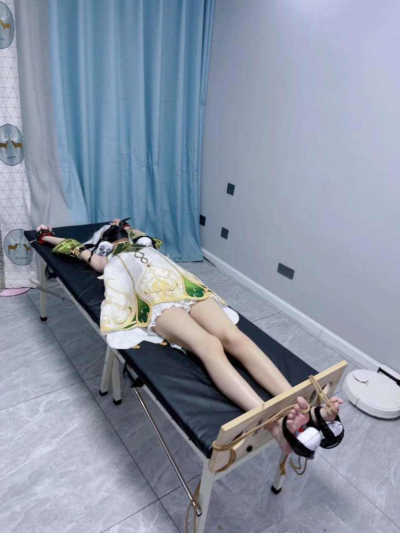 采访时只解开双手,脚底的按摩器会一直打开,茶茶需要在忍受足底挠痒的情况下回答问题~