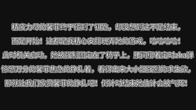 精疲力尽的馨菲终于碰到了钥匙,却没想到这不是结束,而是开始!这都是我精心安排玩弄她的游戏,哈哈哈哈!