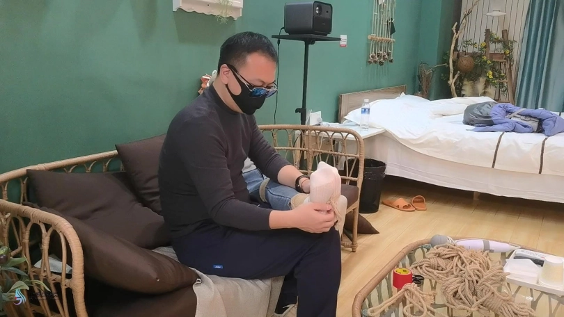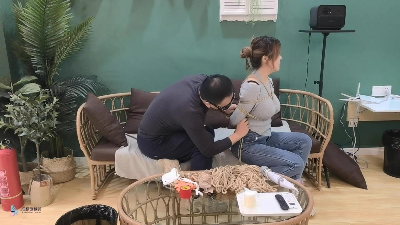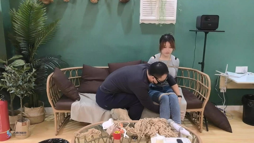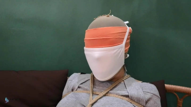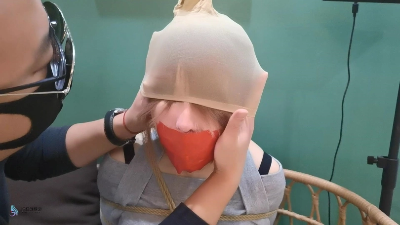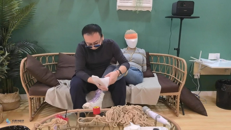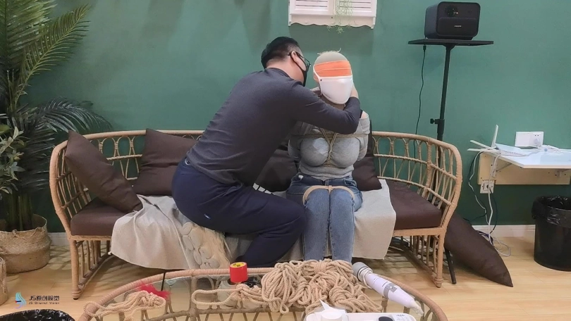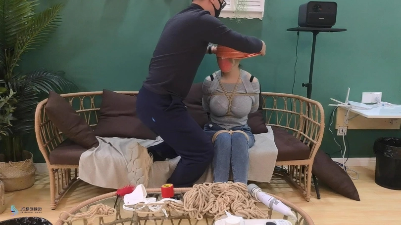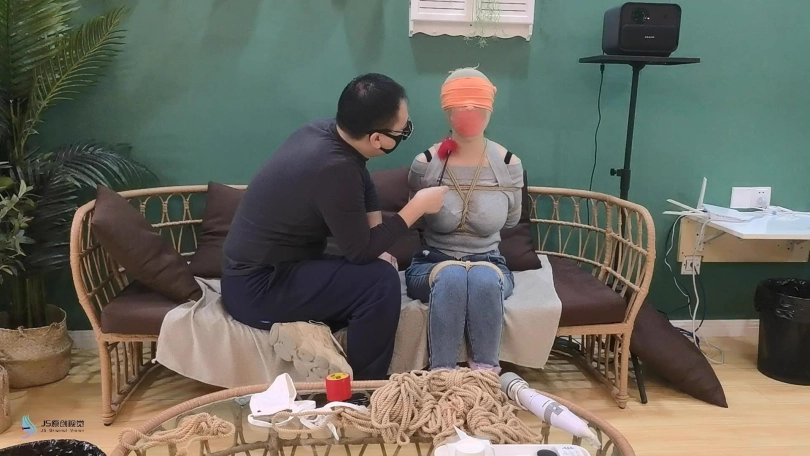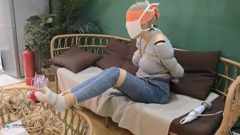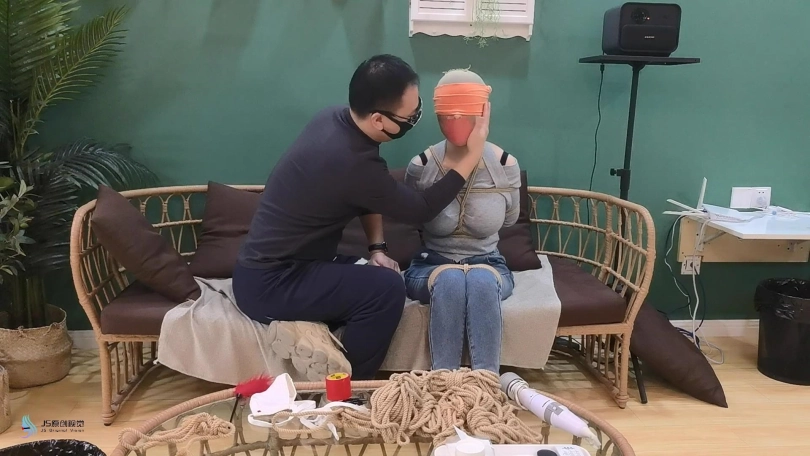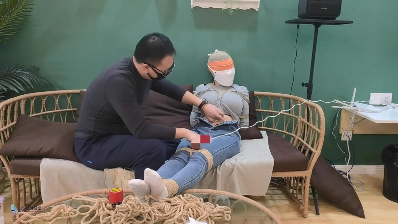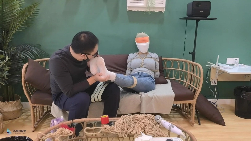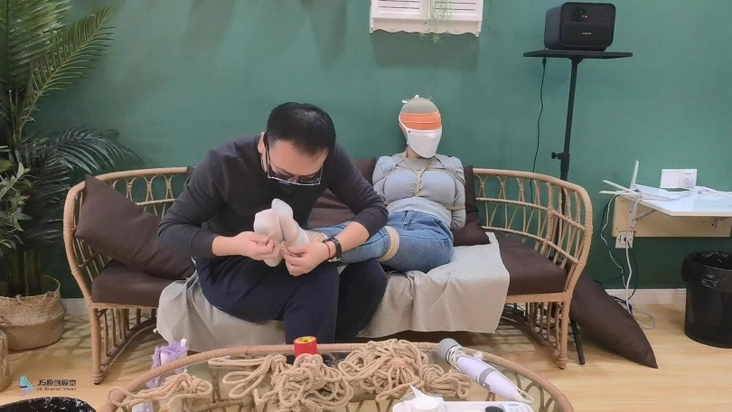 女人网购了一些绳子等玩具等着老公回来,男人回来后,女人就迫不及待的说要玩点刺激的游戏,让男人用桌上的绳子绑她。男人将她捆绑起来,用丝袜塞进她的嘴里,外面用胶带封住她的嘴,放置她吐出嘴里的丝袜。再用丝袜头[X_X]住她的头。用一双连裤袜蒙住她的眼睛,给女人再带上一个口罩。这样紧绷的头部轮廓看起来很性感。男人脱下女人的靴子,不断亲吻女人的穿着棉袜的脚丫。将她的脚捆绑起来,开始挠她的脚底。过了一会,男人用快乐棒刺激着女人的裆部,强烈的刺激感让女人身体扭动,脚趾不断的绷紧并发出呻吟声。看起来她很享受。