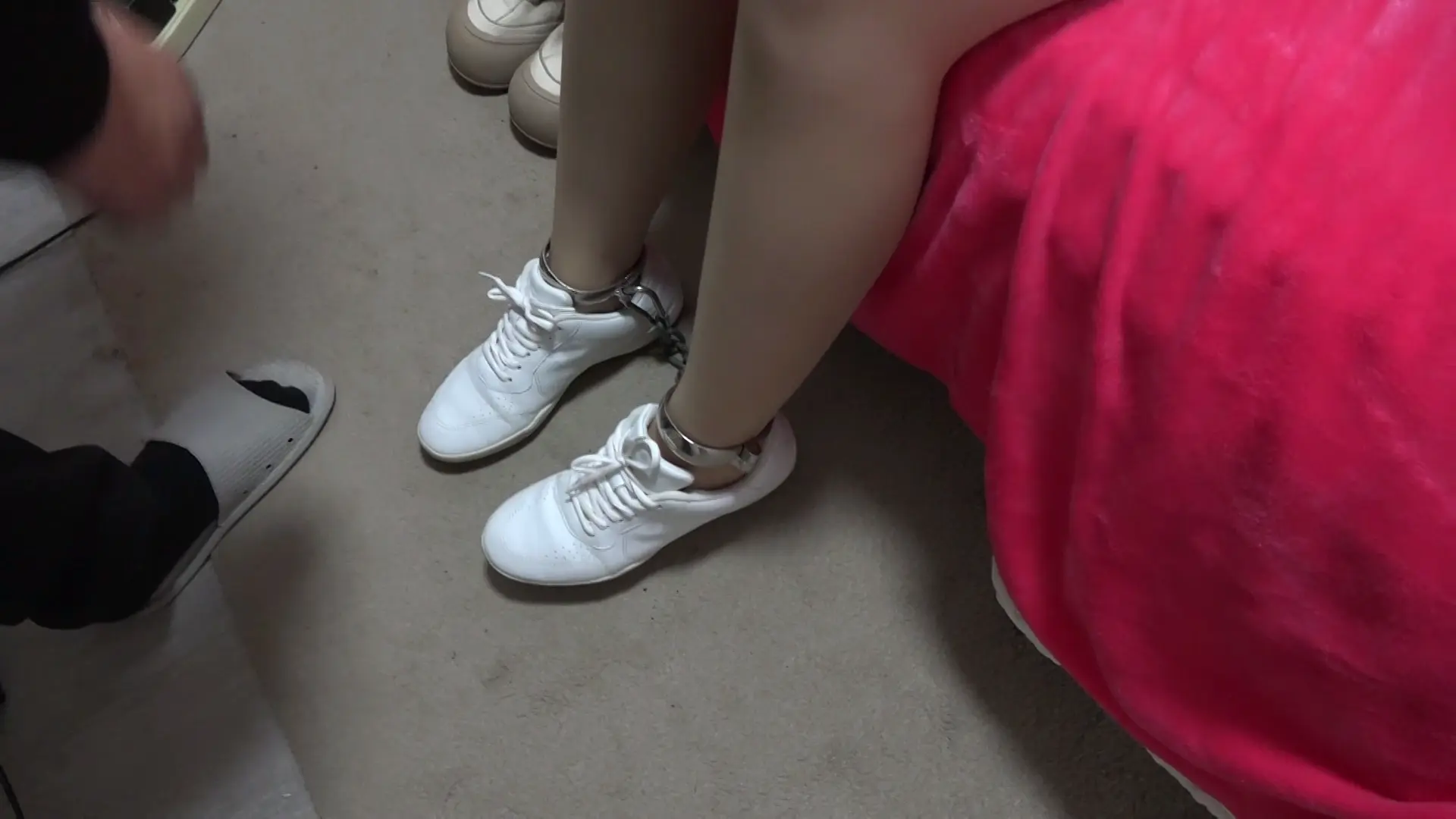 说完黄珊珊便挂掉了电话,镜头拉远,黄珊珊露出惊恐的表情,旁边拿着棍子的男人也露了出来,此时,黄珊珊的双脚也是戴着脚镣。
