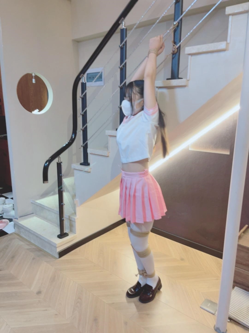 让糖糖穿上可爱的粉色jk制服,穿上jk小皮鞋(这短暂的换装时间也是她唯一能休息的时间了),然后用多道绳子紧紧拘束大腿、小腿、脚腕。然后把手腕拉到最高,直到强制踮脚脚尖才能勉强接触到地面为止。如果放下脚,绳子就会狠狠勒紧手腕,并且手臂承受全部体重~算是个简单的predicament吧~