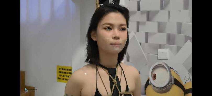 小美女夏瑾身穿兔女郎套装渔网袜和黑色高跟鞋,性感又不失青春靓丽,还有很体现个性的唇钉,站立龟甲缚并腿缚后滴入柠檬汁后金属马具口球堵嘴流口水,还有透明胶带和银色胶带封嘴,最后柠檬和白色口球口水不断的流出,模特也非常可爱,可惜模特现已退圈