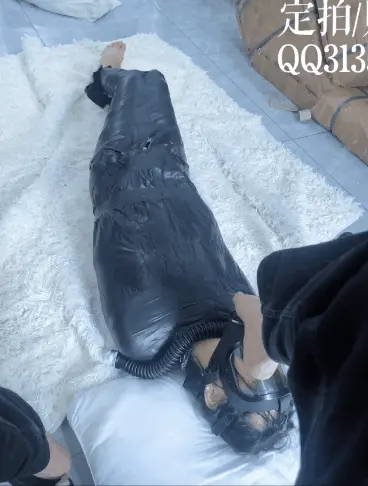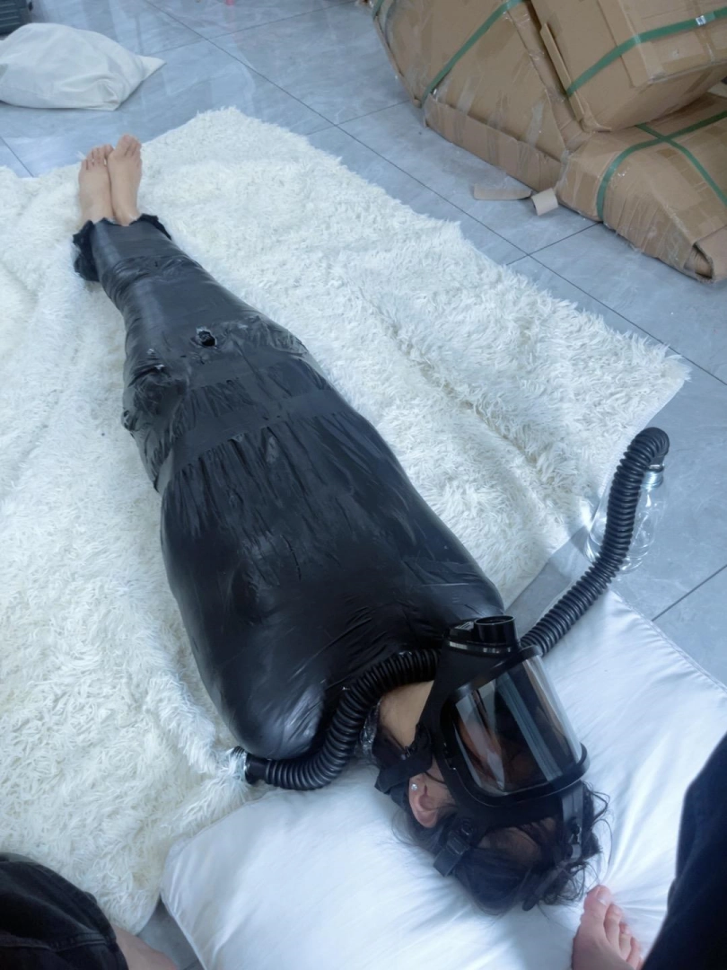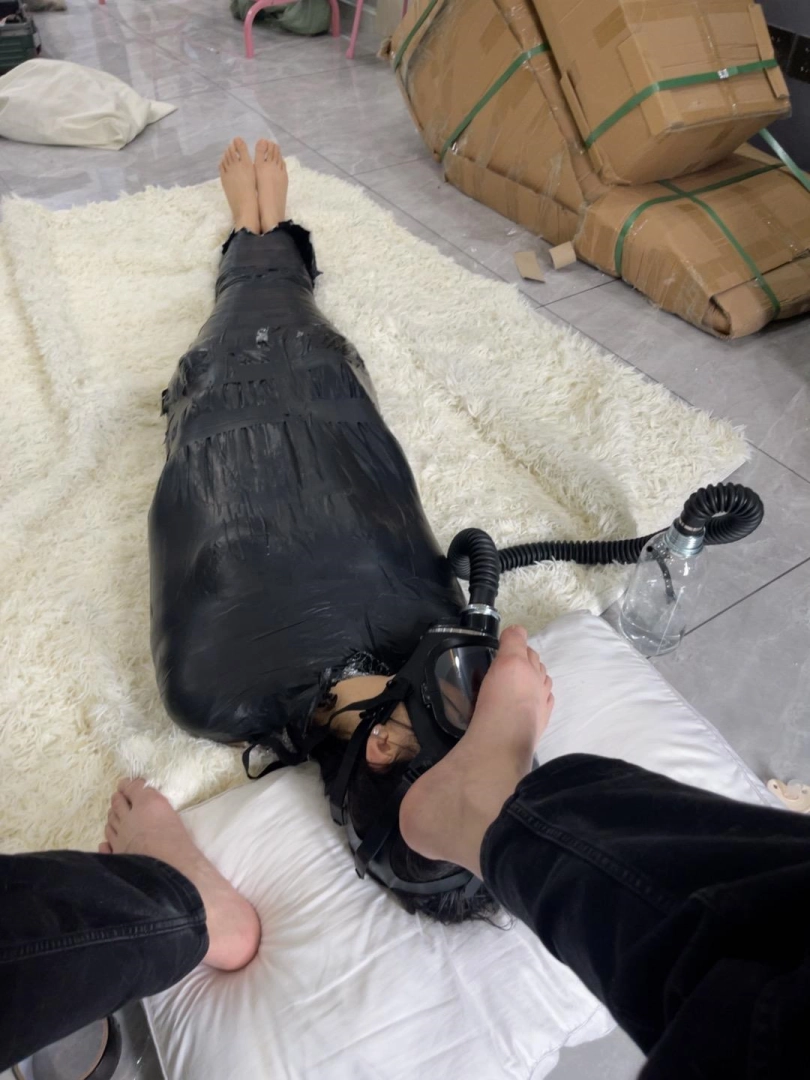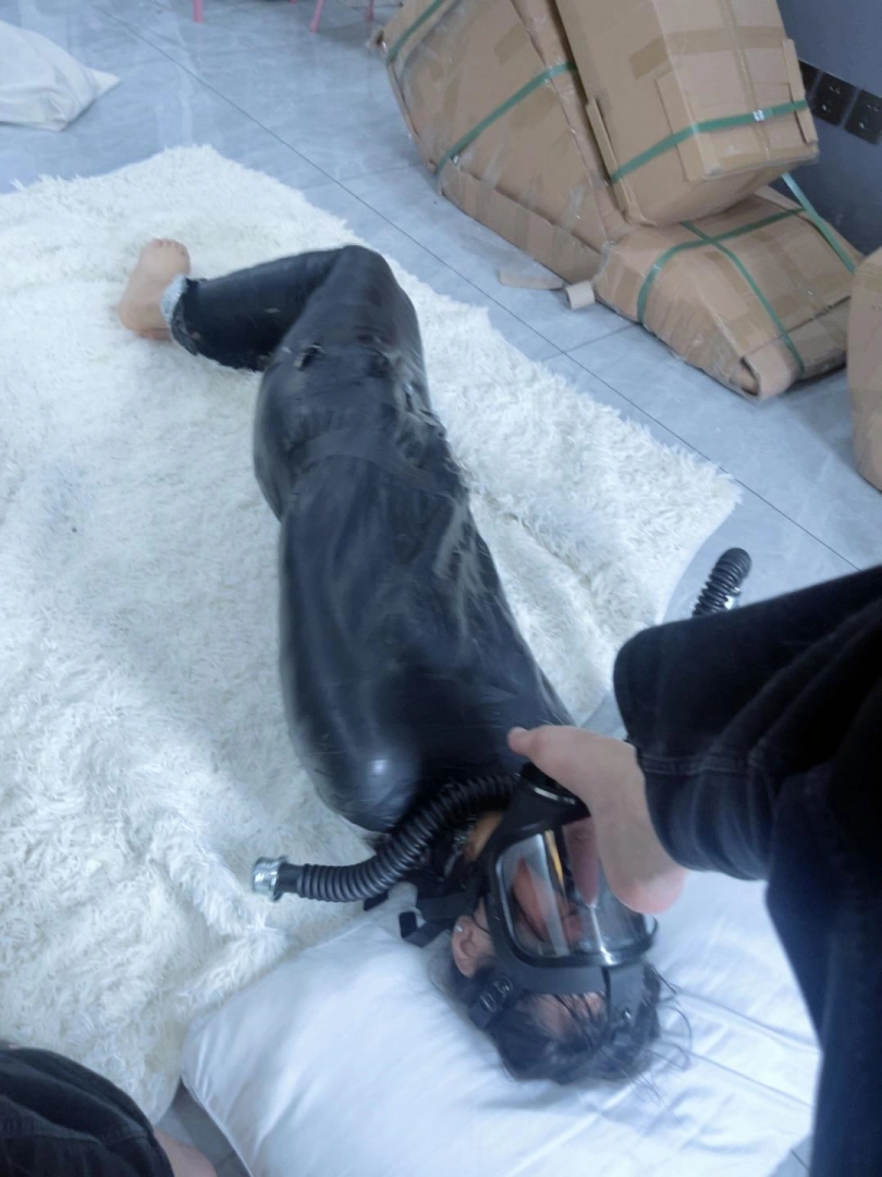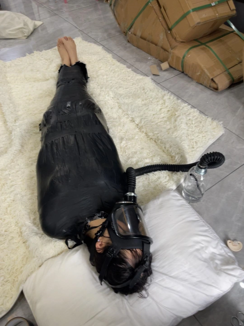 一小时后我才卸下负压瓶,不过还是要用手堵住呼吸孔。就这还不过瘾,我直接用脚堵住呼吸孔,妹子的求生欲使得她为了呼吸还是会继续拼命的嗅闻吸气..嘻嘻!