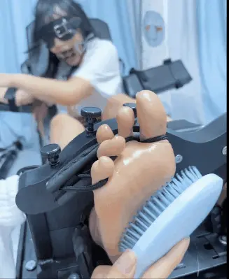 最后超级有节目效果,妹子哪怕解开双手都无法阻止脚底被挠痒——脚底被牢牢固定不说,挠痒的时候还会脱力!
