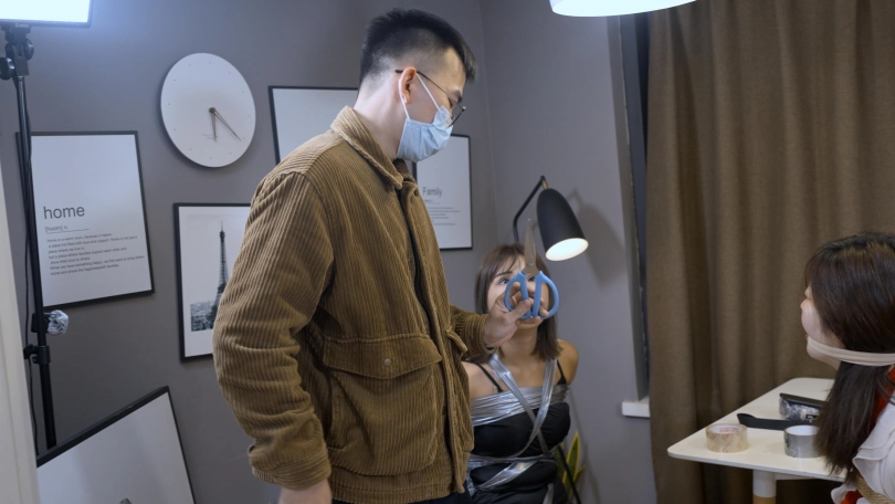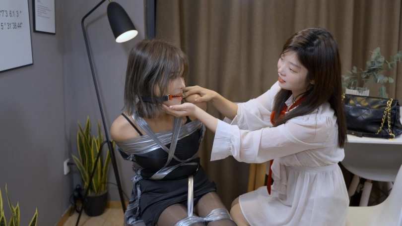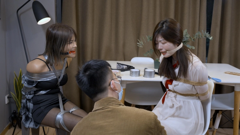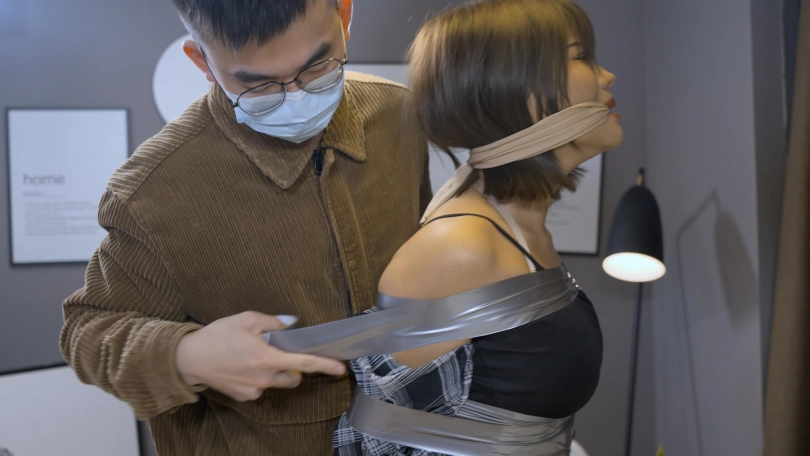 绑匪进门绑了女主,女主闺蜜下班回来不仅不放开,还用胶布加固了,而劫匪在楼上看着这一切,最后闺蜜自己也被绑了