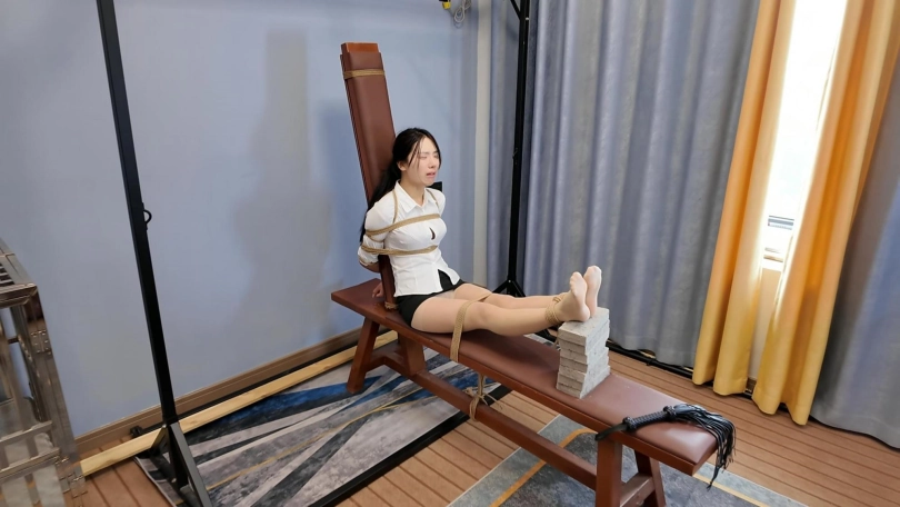 客户要求必须加七块砖,并且要求必须给十一虐哭,事先没有给十一说客户的特殊要求,先哄上老虎凳,绑上再说,一块一块的加,中间加挠脚心和鞭打,刚开始挠脚心十一笑的可开心了,到第六块砖的时候喊疼,马上就成功了,现在绑着呢,可是由不得她了,继续加,没想到加到七块砖喊疼还是没有哭,用力一按腿,这下可好直接哇哇大哭,赶快特写拍摄,接下来一顿好哄