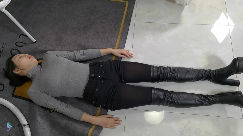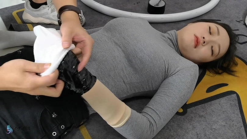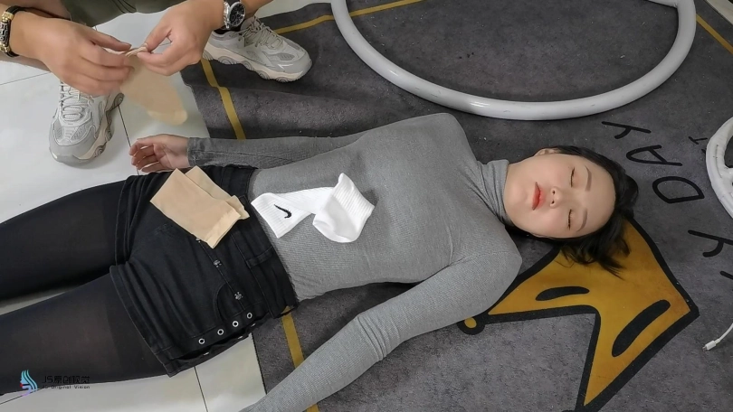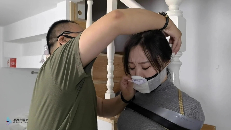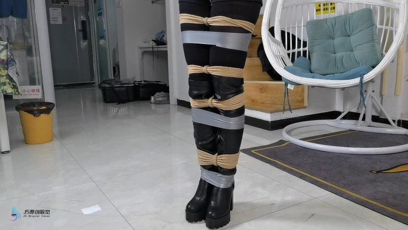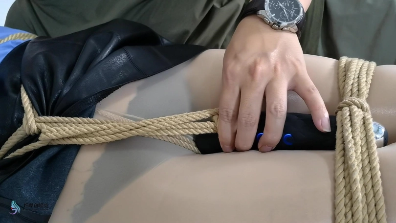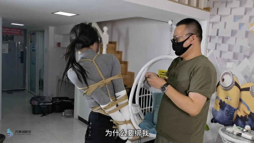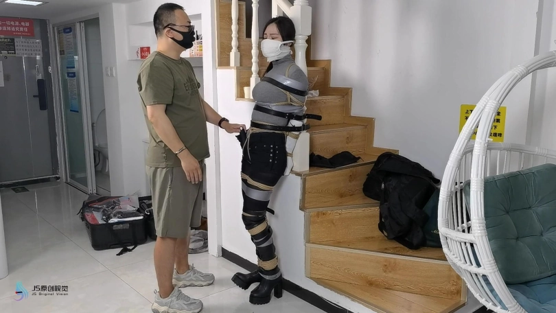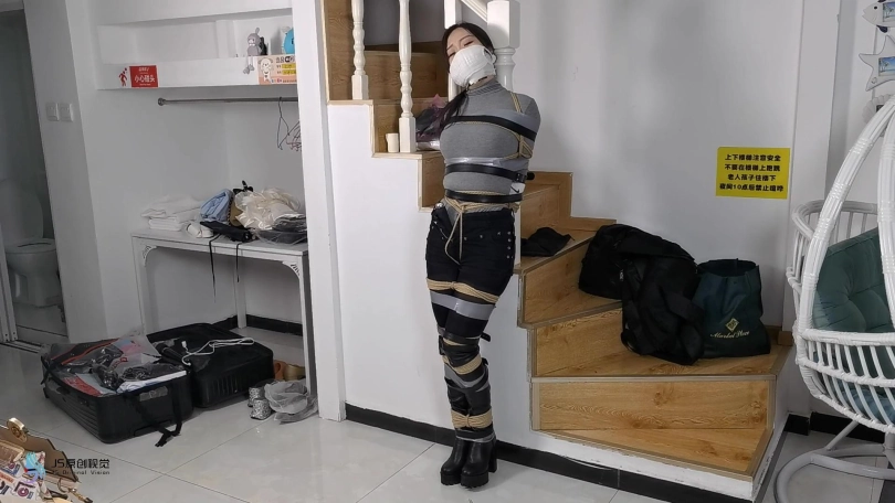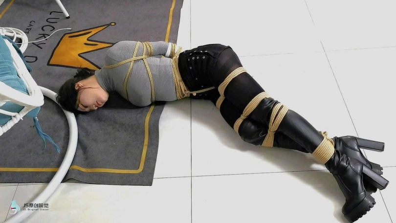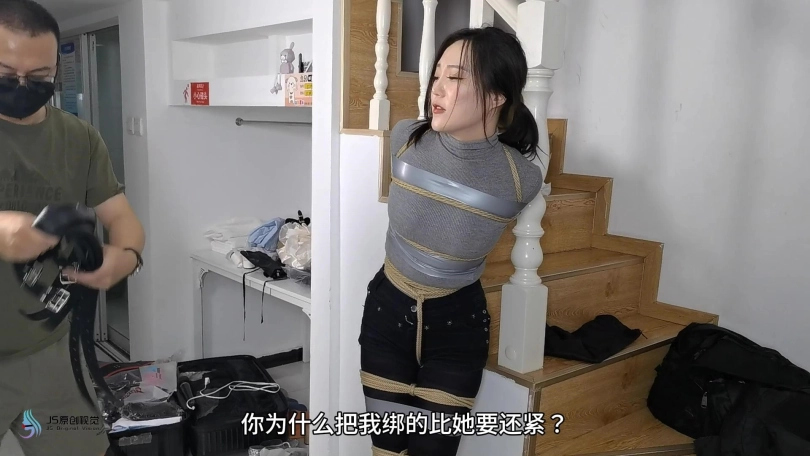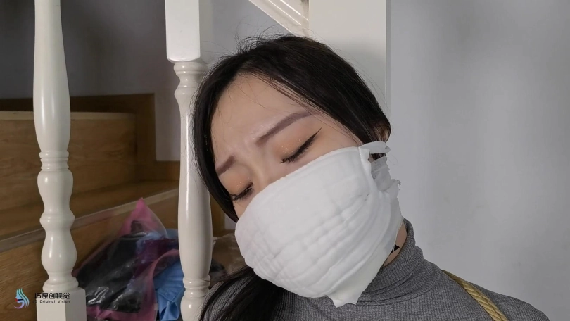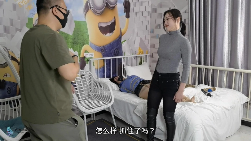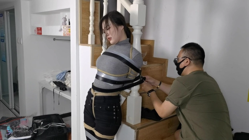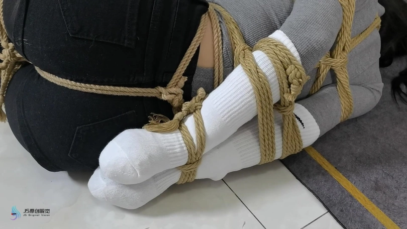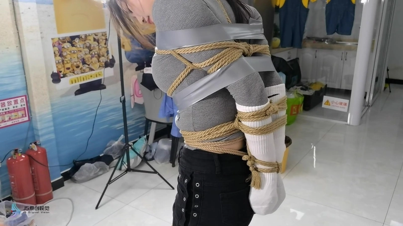 女搜查官李然被哈妮递到后被绑着玩弄得全身软瘫后,哈妮穿回长靴正想离开房间,而李然继续被放置在床上,[X_X]继续震动。此时男同伴进入房间,问哈妮是否用魔绳递到了女搜查官。正当哈妮和男同伴对话后转过身时,男同伴突然拿出了一块手帕把哈妮弄晕,准备把哈妮也捆绑上一拼卖掉。男同伴把哈妮捆绑之前,他把李然的[X_X]弄了出来,然后换上了一支[X_X]绑在李然的双腿之间后打开,然后向李然表示在这个状态下看好戏。李然可惨了,刚不久前才承受完TD的折磨,连气还没回复过来更要接受接下来棒棒的刺激,再这样下去,她可根本受不了不断的GC。男同伴任由李然在床上忍受刺激,他先把哈妮的双手各自握成拳头,然后各自套上三只肉色短丝袜,用黑色静电胶带把各自的拳头完全缠绕,之后套上两只白色中筒棉袜。魔绳此时溜过去哈妮的身边,把她的全身捆绑成和李然相同的。哈妮此时醒了过来,问男同伴究竟要干什么,男同伴表示也要把哈妮一同卖掉。哈妮一直咒骂着男同伴,但男同伴没有理会,他更表示要把哈妮捆绑我更加严厉些,之后用胶带把哈妮的上胸、下胸、腰部、大腿、膝盖上下和脚踝进行拘束,床上的李然棒棒的折磨下观看着过程继续挣扎强忍GC。男同伴把哈妮拉过去床边的一条柱子,然后用拘束皮带把哈妮的全身固定在处子上。他拿来了一条肉色连裤袜,把整条连裤袜慢慢地塞进哈妮的嘴巴,用黑色的大胶布把哈妮的嘴巴、面颊和下巴封了起来。男同伴愈堵愈兴奋,他更脱下了自己的一只臭棉袜按在哈利的鼻子和嘴巴上,用一卷白色的绷带进行缠绕,最后戴上了一只大白色棉口罩盖过整个鼻子和嘴巴,使哈妮几乎发不出声音。男同伴准备了另一支[X_X],从哈妮的黑色连裤袜的袜腰[X_X]打开,之后不断抚摸哈妮的丝袜脚和胸部,哈妮认不住发出弱小的呻吟声,身体在棒棒的刺激下很快便忍不住颤抖起来,却在严厉的捆绑下完全反抗不了,原来男同伴他一早已对哈妮起了色心。男同伴不忘床上的李然,忍不住把她卖出前玩弄过爽,没有放过李然的意思,那怕她已经疲惫不堪的。 在旁站着的哈妮在五官被剥夺和四肢不能动的情况下,也全力接受着棒棒的折磨。