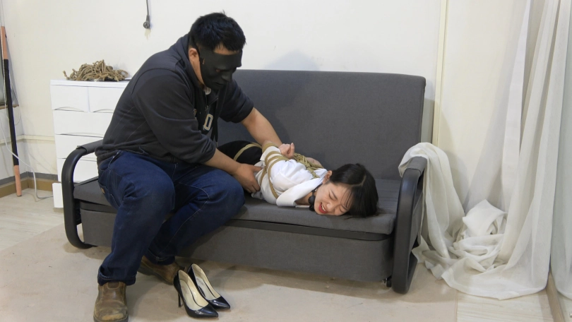 华冰冰开门。彪哥上来迅速捂住华冰冰的嘴巴,给华冰冰戴上手铐脚镣,然后推动到室内。