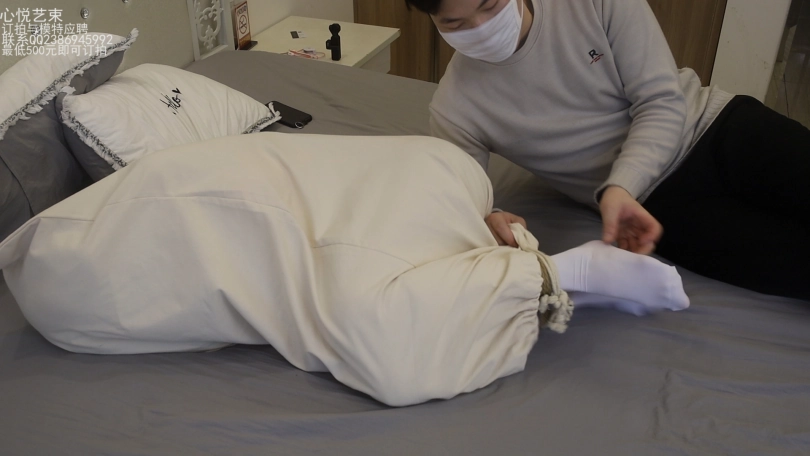 雅雅趴在床上玩手机 没有注意到绑匪靠近 绑匪把她捆了起来 雅雅大声喊救命 绑匪拿了一团袜子塞进她嘴巴里 又拿一条袜子勒住她的嘴 雅雅在床上拼命挣扎 绑匪打她的屁股让她老实一点 绑匪拿出一条麻袋 抓起雅雅的白丝脚往麻袋里装 雅雅被整个塞进去了麻袋 绑匪用手抓紧袋口任凭雅雅在麻袋里挣扎 拿起一条绳子把袋口扎紧 把麻袋在床上放置了一会 绑匪把麻袋抱在怀里 不停地揉捏麻袋里雅雅 隔着麻袋挠她的身子挠她的脚 麻袋里的雅雅只能拼命蠕动发出呜呜的呻吟 雅雅在麻袋里呜呜的说我要上厕所 绑匪把麻袋放在地上 打开了袋口 把雅雅放了出来 绑匪扶着雅雅站了起来 绑匪一回头 雅雅想要逃跑 蹦跳着往外走 但是绑匪逮住了她 并拿起麻袋罩在她头上 又一次把她装进麻袋 把腿蜷缩进麻袋只留一双白丝小脚在袋口拼命挣扎 绑匪开始挠雅雅在脚 挠了一会 绑匪把她的脚也按进麻袋 把麻袋口用绳子绑紧 打她屁股 最后只留雅雅在麻袋里蠕动翻滚