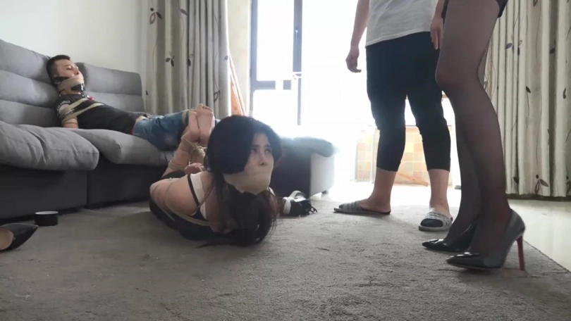 年轻美女孙甜从昏迷中醒来,发现自己和丈夫被五花大绑,嘴里带着口球坐在沙发上。