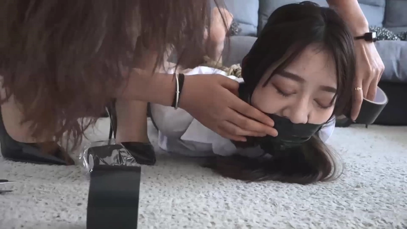 媛媛坐在沙发上奋力挣扎,与梁静不同的是她成功挣脱了捆绳,撕掉封嘴胶布胶带绷带,拽出口中肉色连裤丝袜大口喘气,这下轮到屋里睡觉的安雅遭殃了。