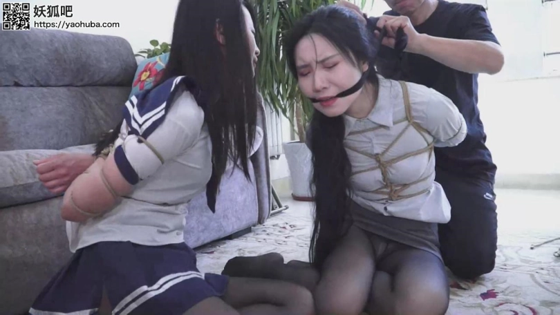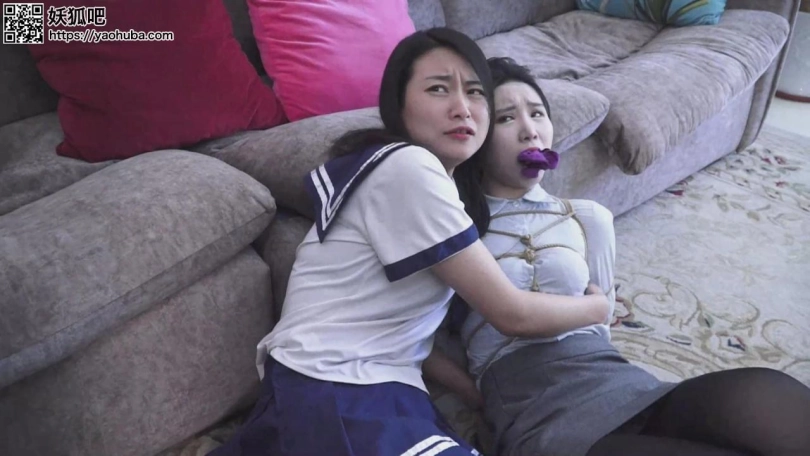 姐妹二人被内裤塞嘴,面对面绑在一起,用嘴挣扎互救却被劫匪发现,姐姐被强行扒下一条丝袜,分别勒住二人嘴巴。