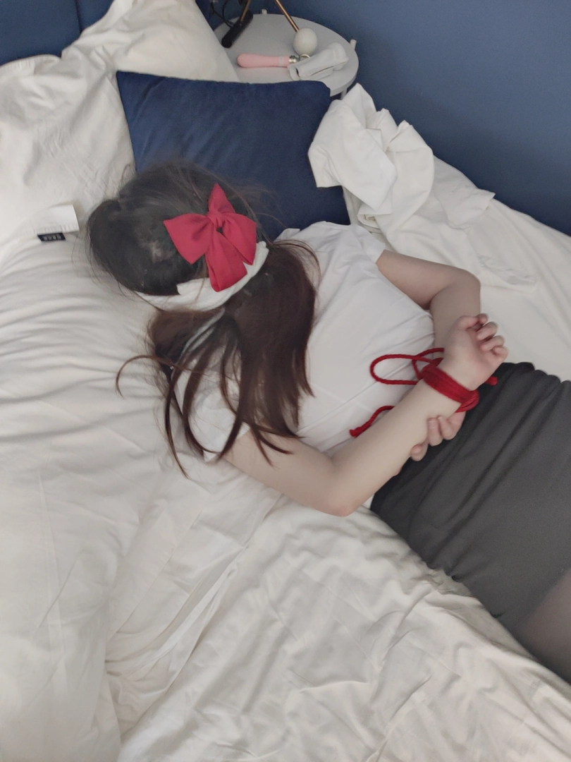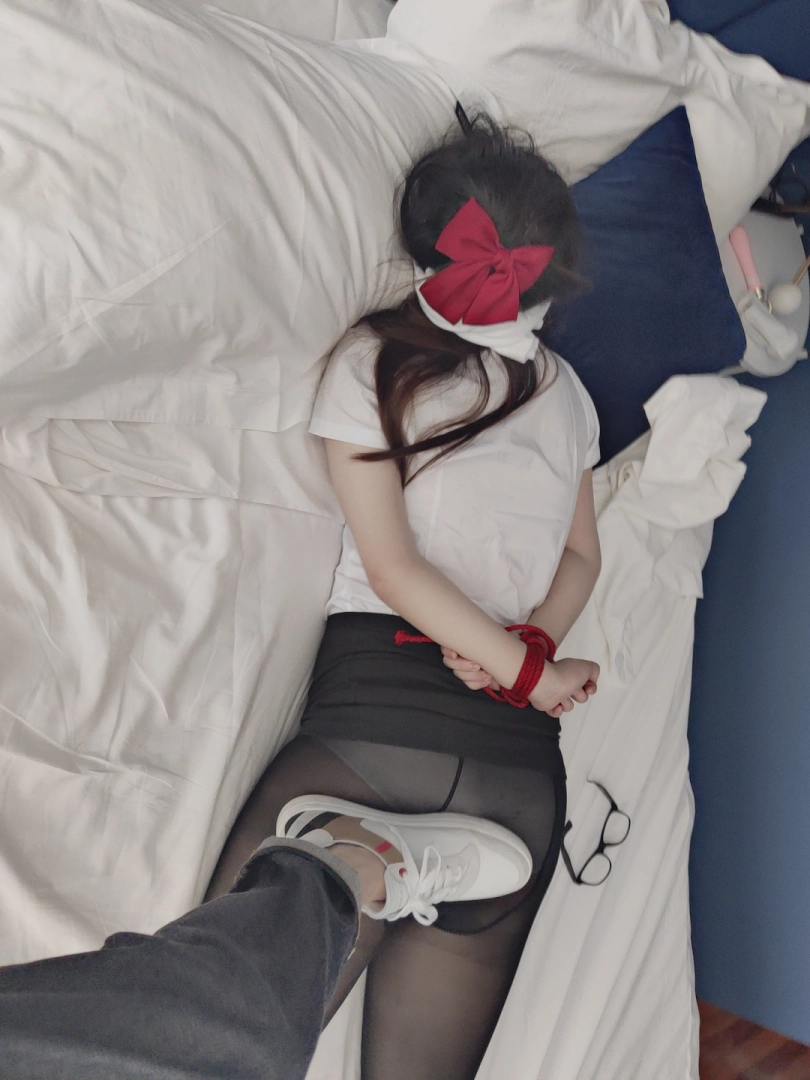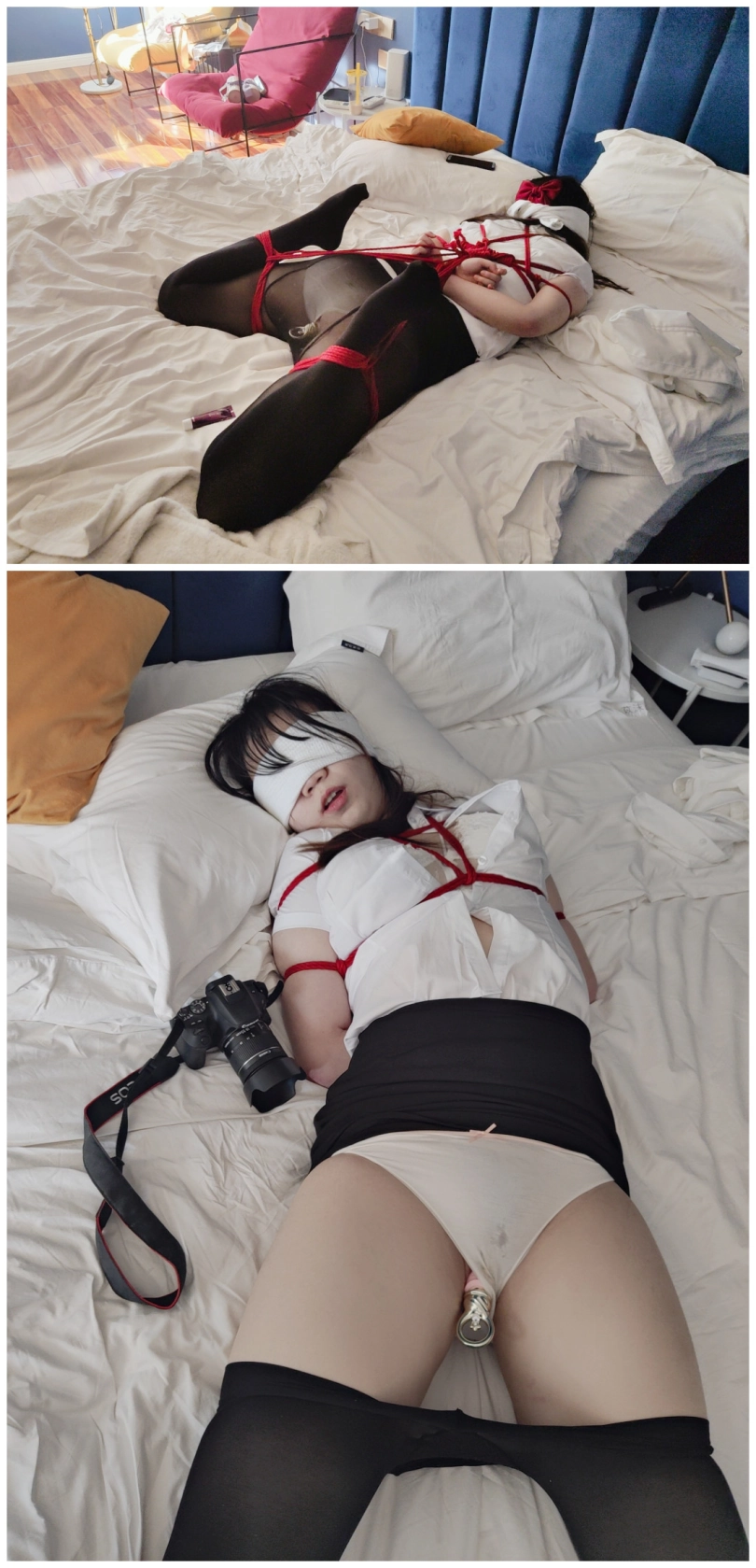 场景3(背面镜头)用绳子把少女绑成驷马,用丝袜和内内支撑魔法棒,让它自己工作一直到GC,然后入体魔法棒不停歇,男生用体外振动按摩怼着下面同时进攻。