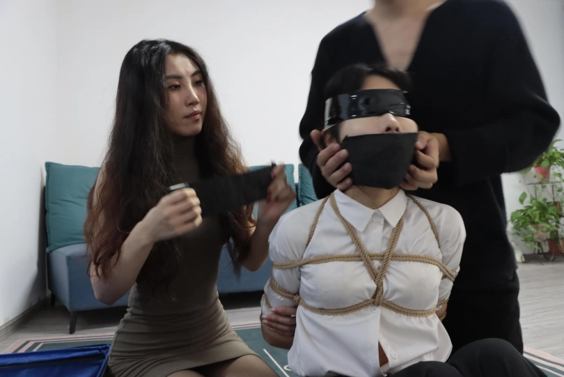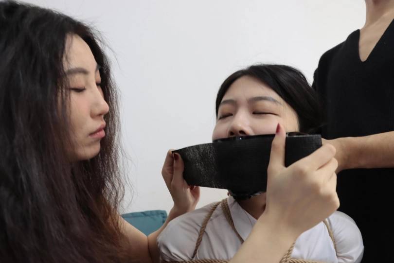 两人用胶带封住米娅的眼睛又缠了两圈绷带,米娅用尽力气想躲可还是徒劳无功。