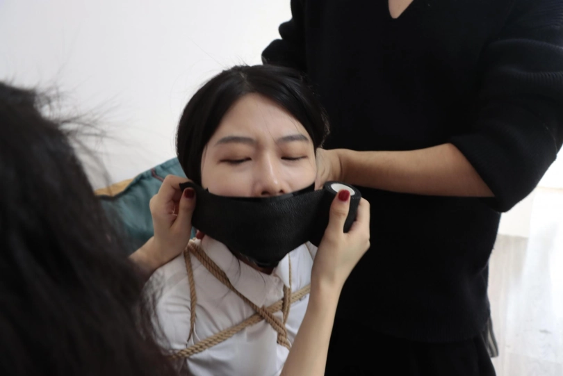 接着用短丝袜套住米娅的双手再用胶带缠住。
