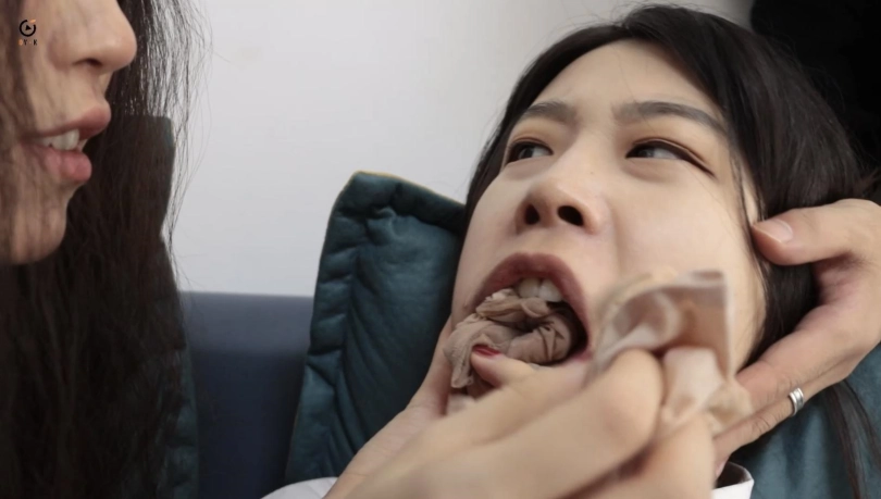 恩可捏着米娅的脸颊将裤袜一点一点塞了进去,可能是觉得不够满,又塞了几双短丝袜(根据模特承受能力定,最好三双),米娅的脸颊鼓了起来。