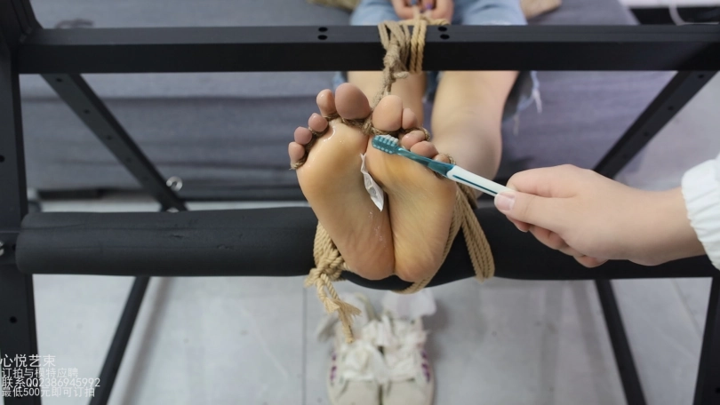 继上次的老虎凳脚枷TK之后,欣然在此挑战超长TK,双脚被绑在一个沉重的铁架上面,十个脚趾也被细绳缠绕绑到后面的铁杆上面,被迫露出粉嫩脚底,再用我平时喝的茶包夹在双脚之间,一旦茶包掉落欣然将迎接5分钟的超频繁全身攻击的TK,最后欣然能否守住jiojio上面的茶包呢,我们拭目以待。PS感觉这是她最接近崩溃的一次TK了,到后期几近虚脱。