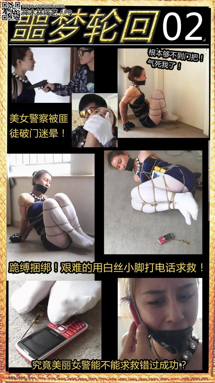 上回说到美女警察被罪犯捆绑炸弹逃脱不得!炸弹爆炸,结果发现是美丽女警的一场梦境。结果美女女警刚出门就被匪徒劫持了,她被麻醉后,强行捆绑成跪缚,这种捆绑方式让她行动困难,就如同一只肉虫,但坚强的女警不肯放弃,她蠕动到大门口,但发现折叠的身体根本够不到门把,她又发现了一个手机,但捆绑成团的她只能用白丝脚趾来打电话,不知道什么时候匪徒就会回来,究竟美女能不能求救成功呢?