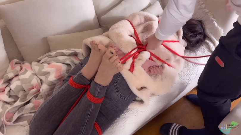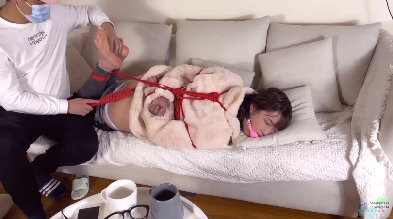 清晨在家看电视无聊玩自缚,无意间 老同学来家里拜访,惊慌失措的安安藏着的绳子随之被发现