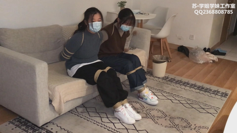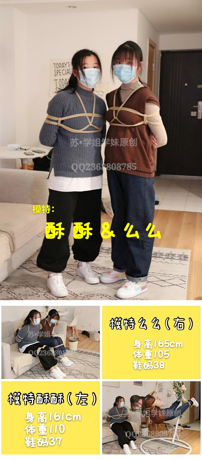 两个可爱的中学生小姐妹一起来试镜,初次体验捆绑。两人刚来的时候超级紧张,站在门口一直往里望,拉着手不赶进来。进来一套五花之后,两人都放松了下来,开始坐在一起被绑着聊天。其中一个练过舞蹈,柔韧性超好,极限驷马不在话下。另一个小时候玩过家人的手铐,把小伙伴铐起来结果解不开了,还被大人打了一顿。五花+超紧驷马+戴镣下跪+戴镣行走,白鞋白袜。(耐克空军板鞋和阿迪stan smith)