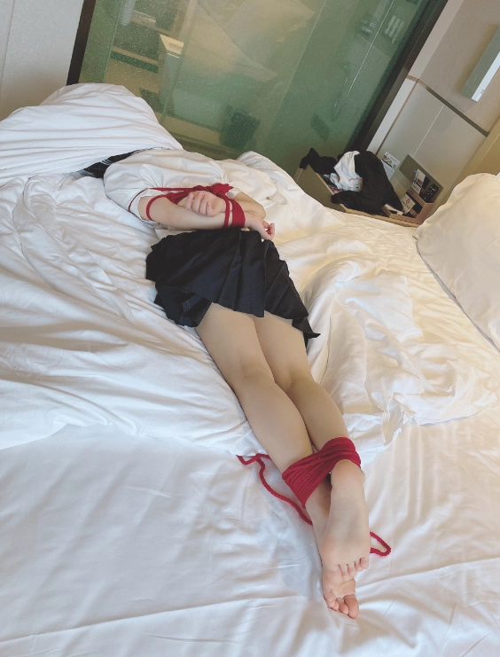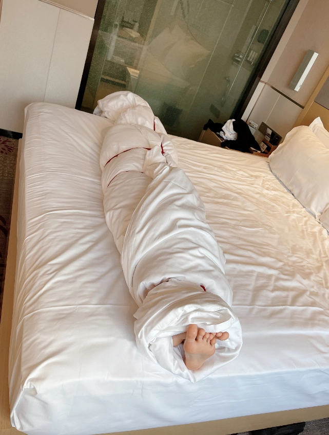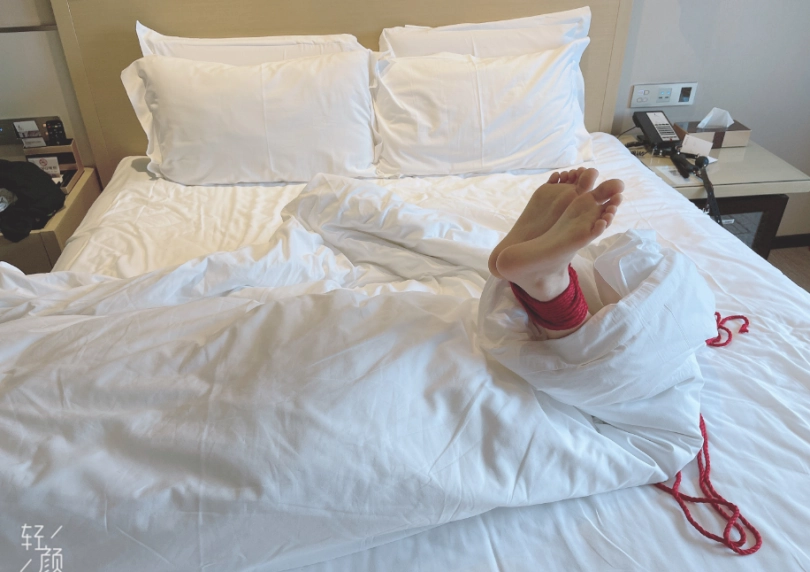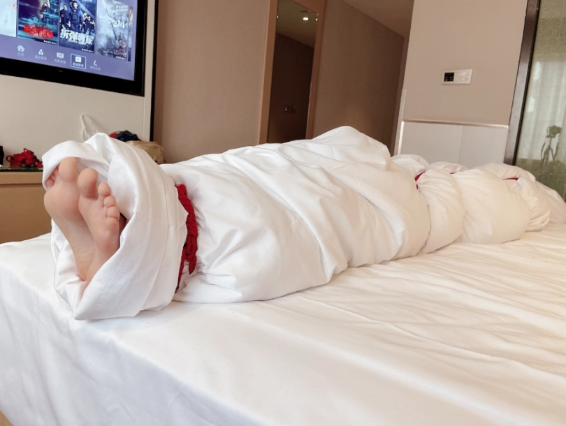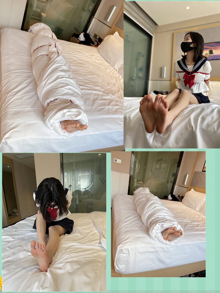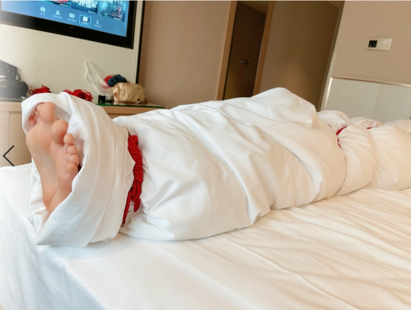 玩够了让少女在被绳子紧缚的状态下平躺,用棉被闷绝包裹,同样用绳子加固棉被,只能露出白嫩的小脚丫任人玩弄~