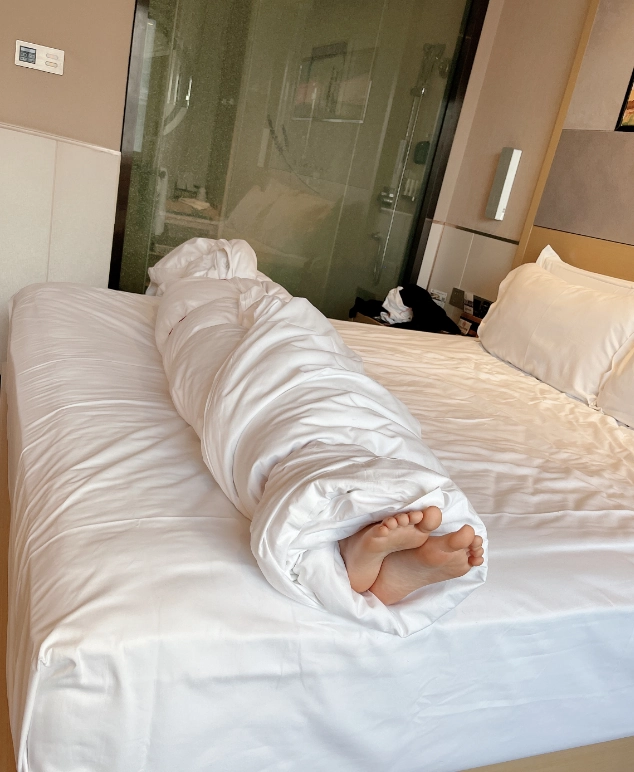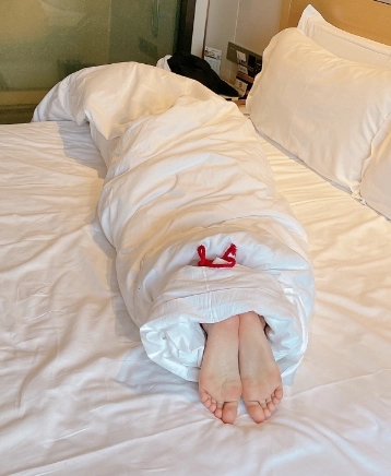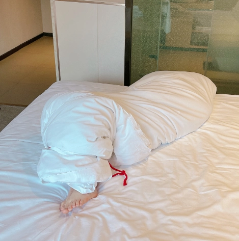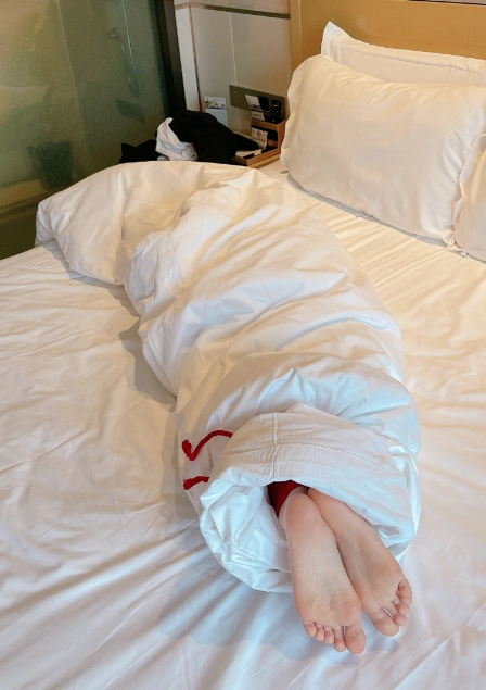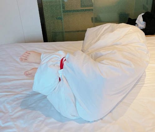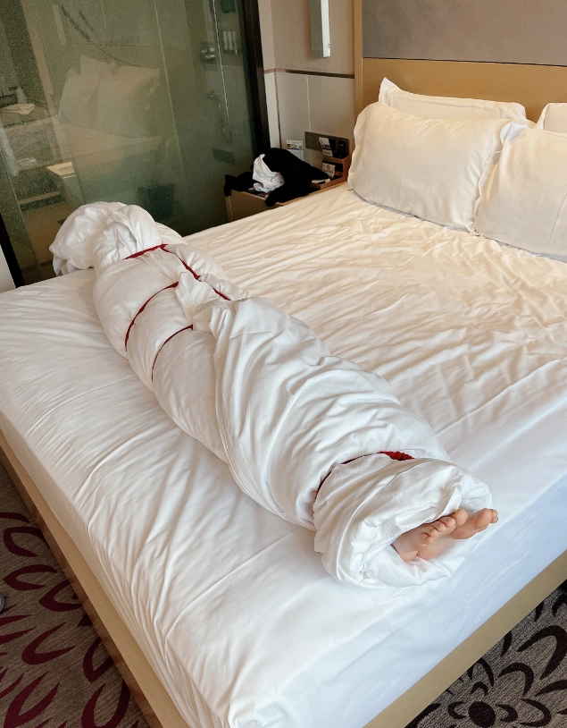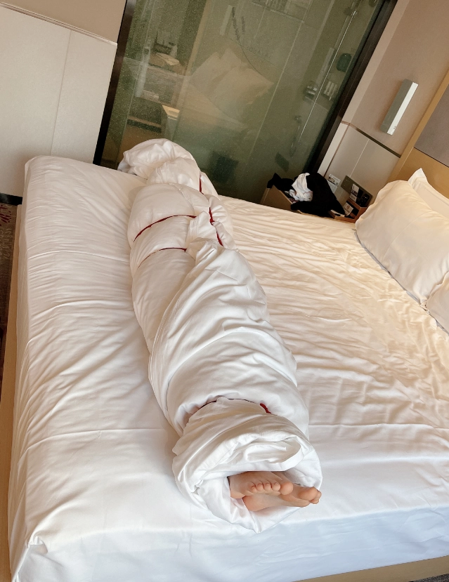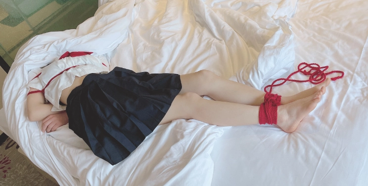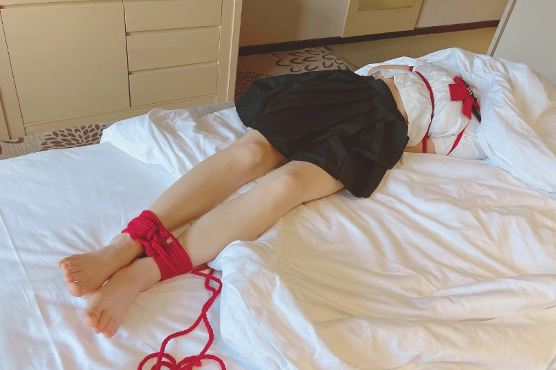 玩够了让少女在被绳子紧缚的状态下平躺,用棉被闷绝包裹,同样用绳子加固棉被,只能露出白嫩的小脚丫任人玩弄~